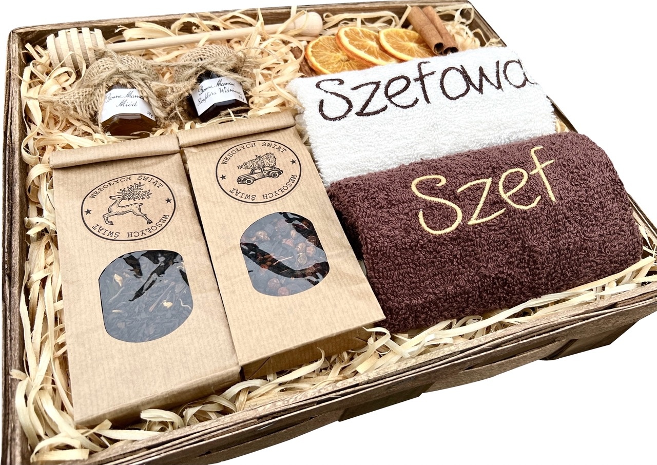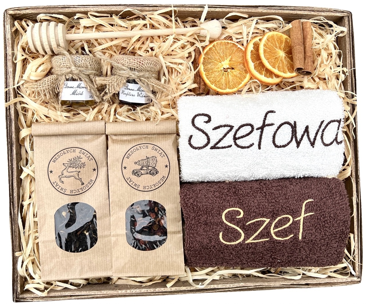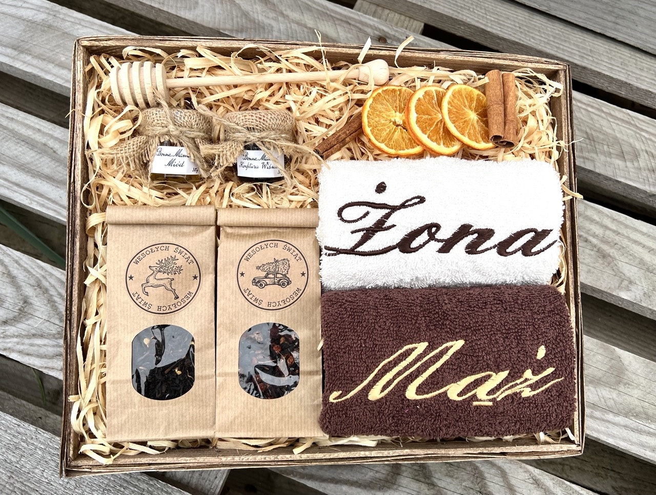 Piękny i praktyczny prezent na Boże Narodzenie dla dwojga - zestaw ręczników, herbat i dodatków. Wyjątkowy uroczy zestaw, który ucieszy obdarowane osoby.