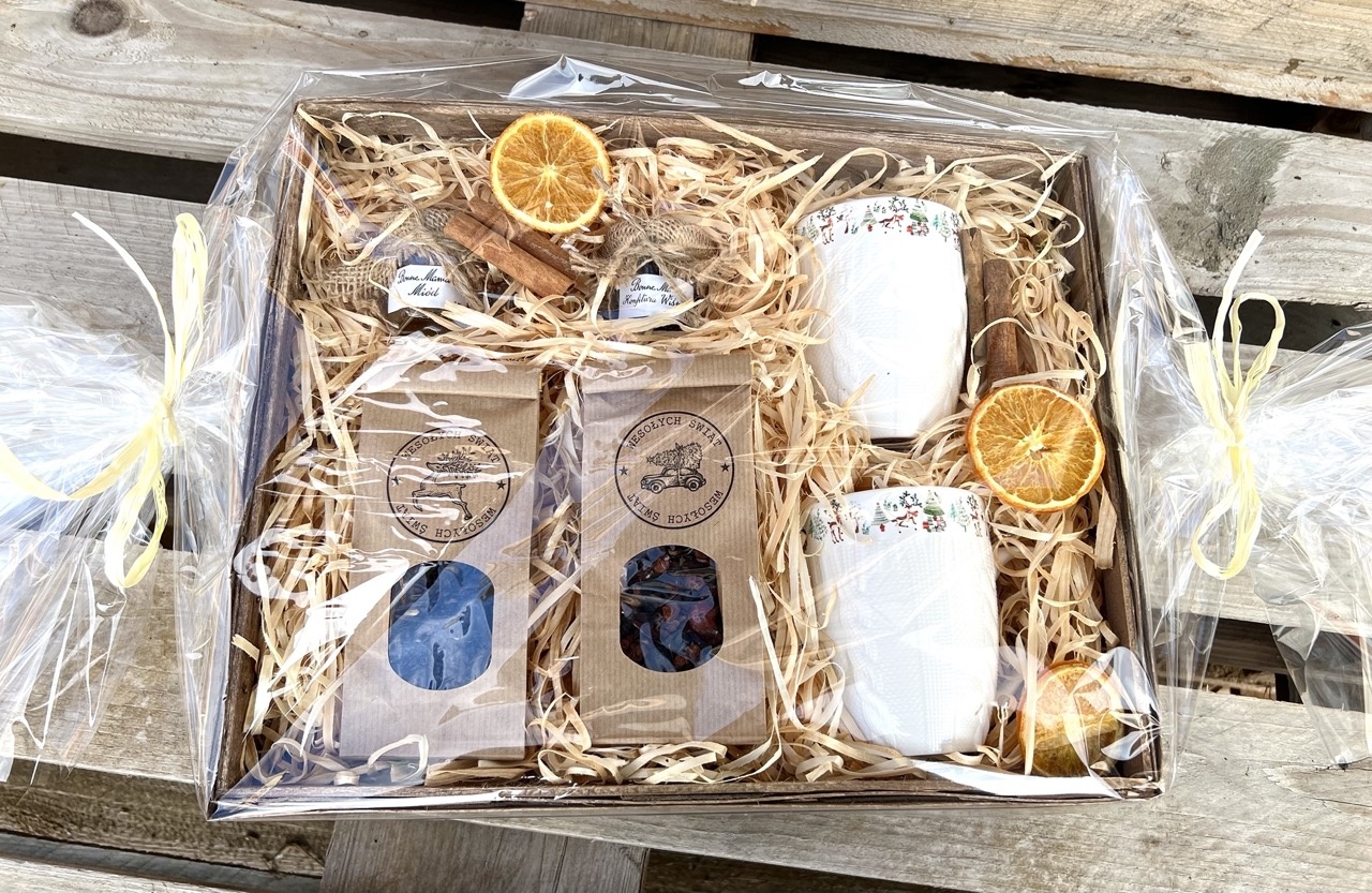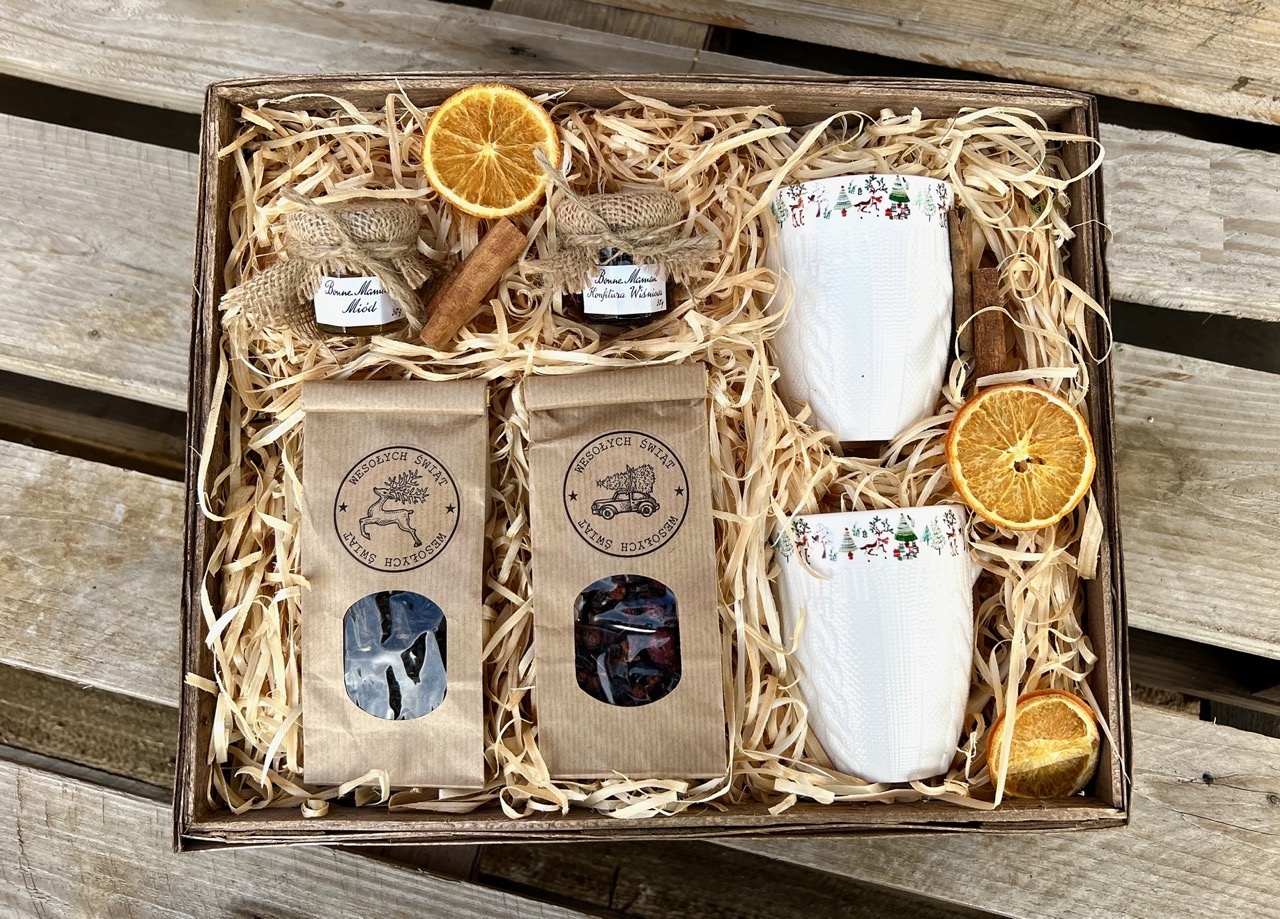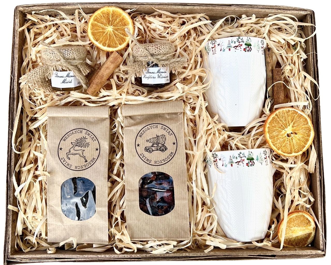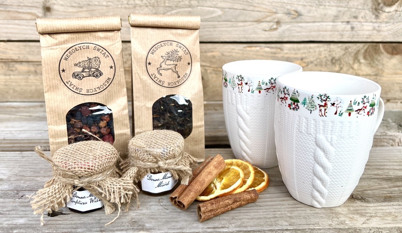 Piękny i praktyczny prezent na Boże Narodzenie dla dwojga - zestaw kubków, herbat i dodatków. Wyjątkowy uroczy podarunek, który ucieszy obdarowane osoby.
