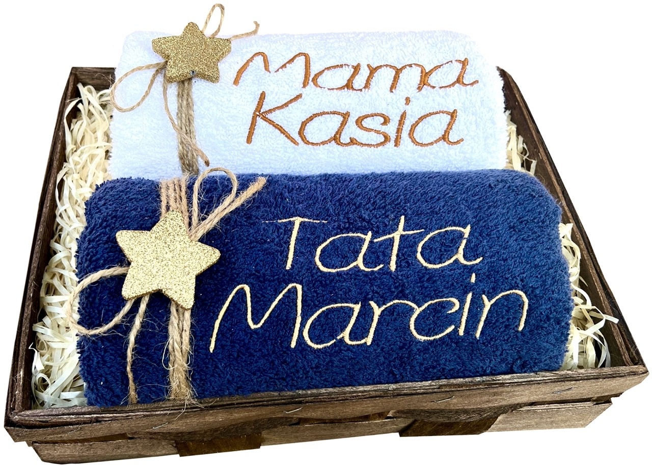 - komplet dużych, grubych ręczników kąpielowych z Twoim haftem imion lub napisów Mama/Babcia + imię, Tata/Dziadek + imię,
