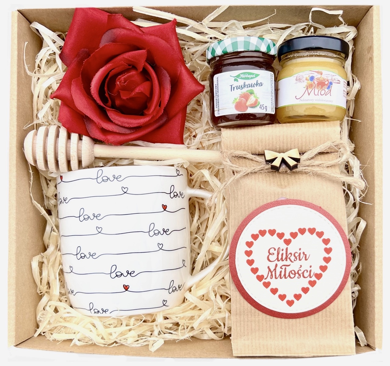 - całość zapakowana w pudełko - eko box z czerwonym serce.