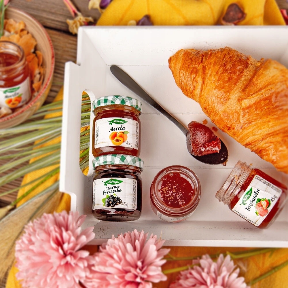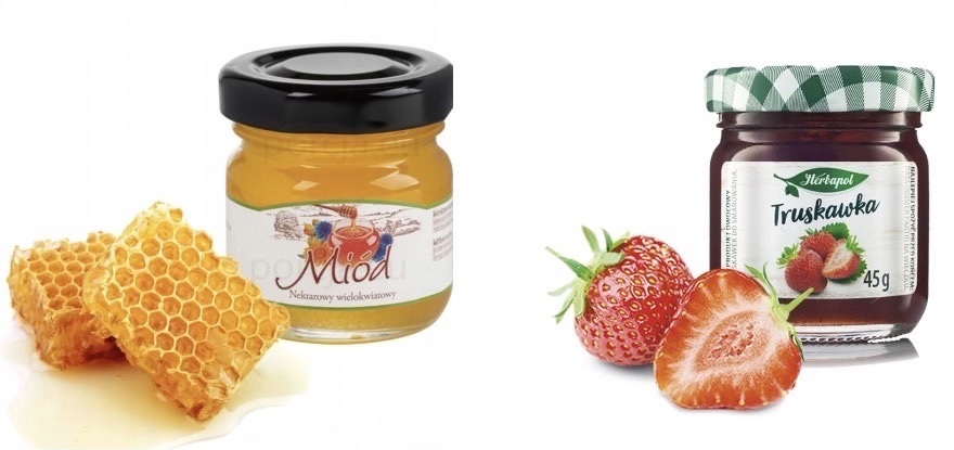 - dżemik truskawkowy (45g) i mód (40g), jako dodatki do herbatki,