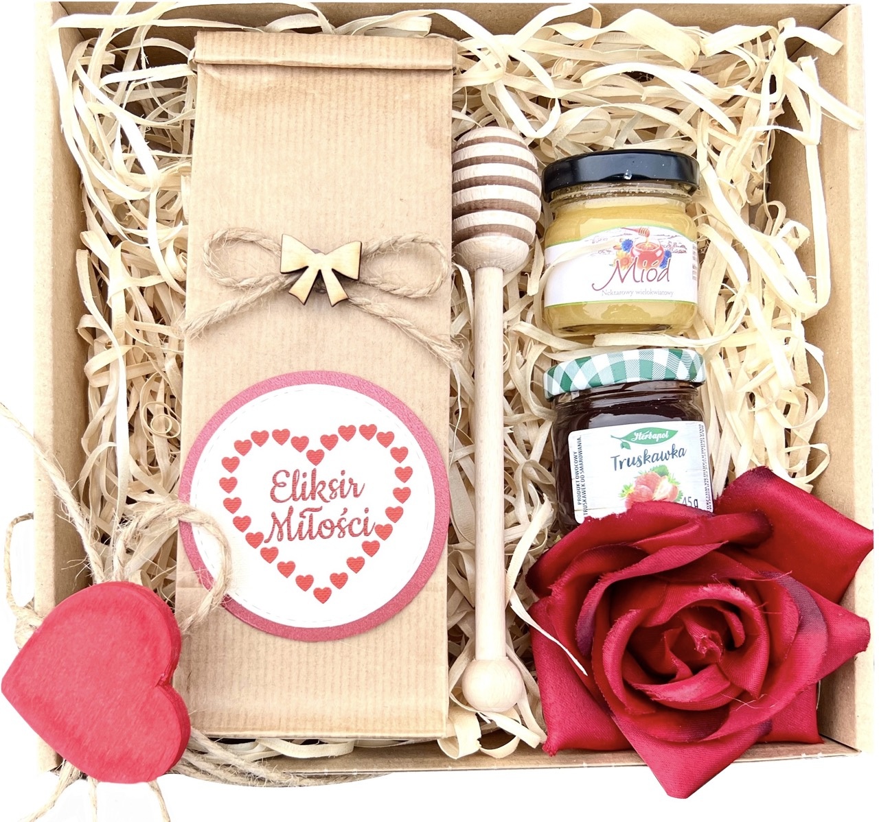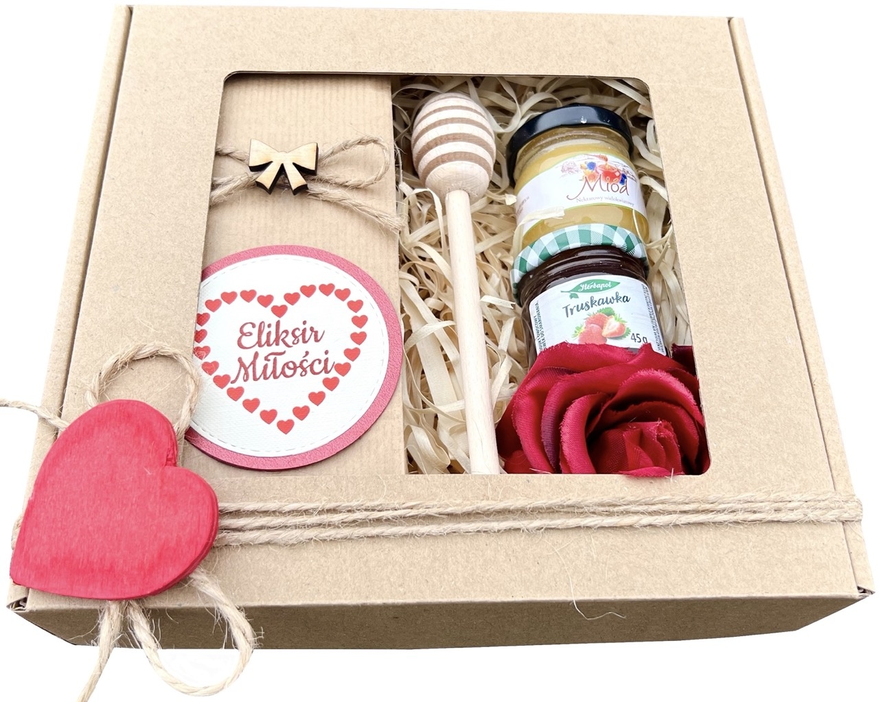 - całość zapakowana w pudełko - eko box z czerwonym sercem.