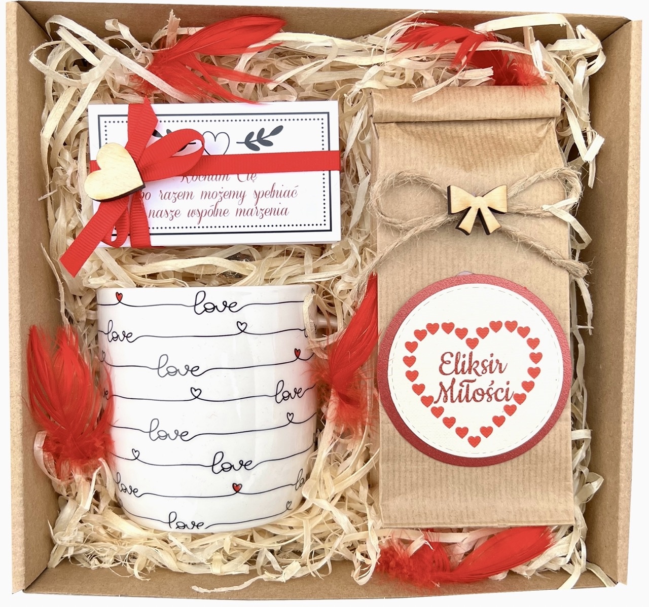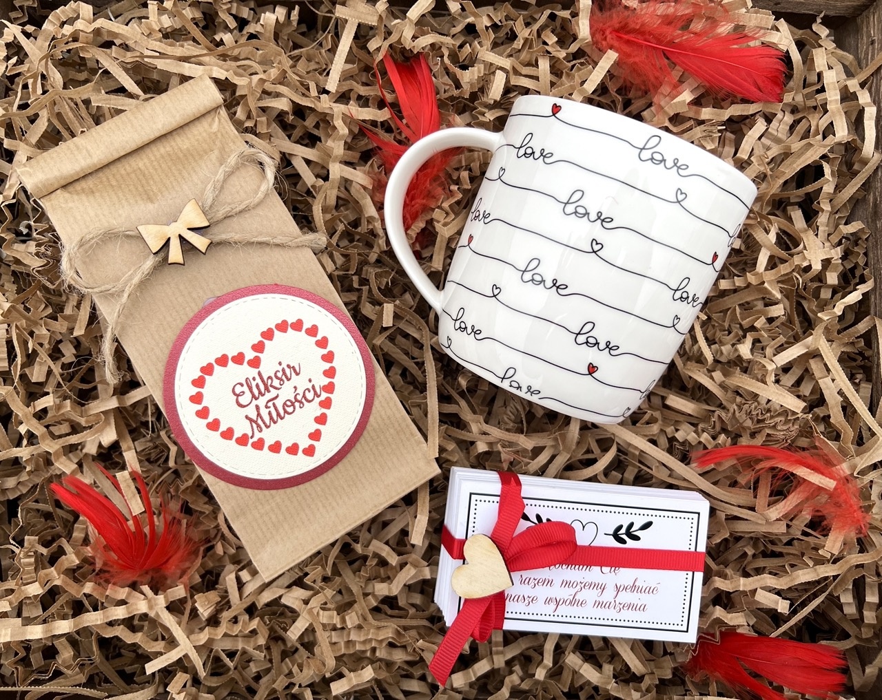 - całość zapakowana w pudełko - eko box z czerwonym sercem.