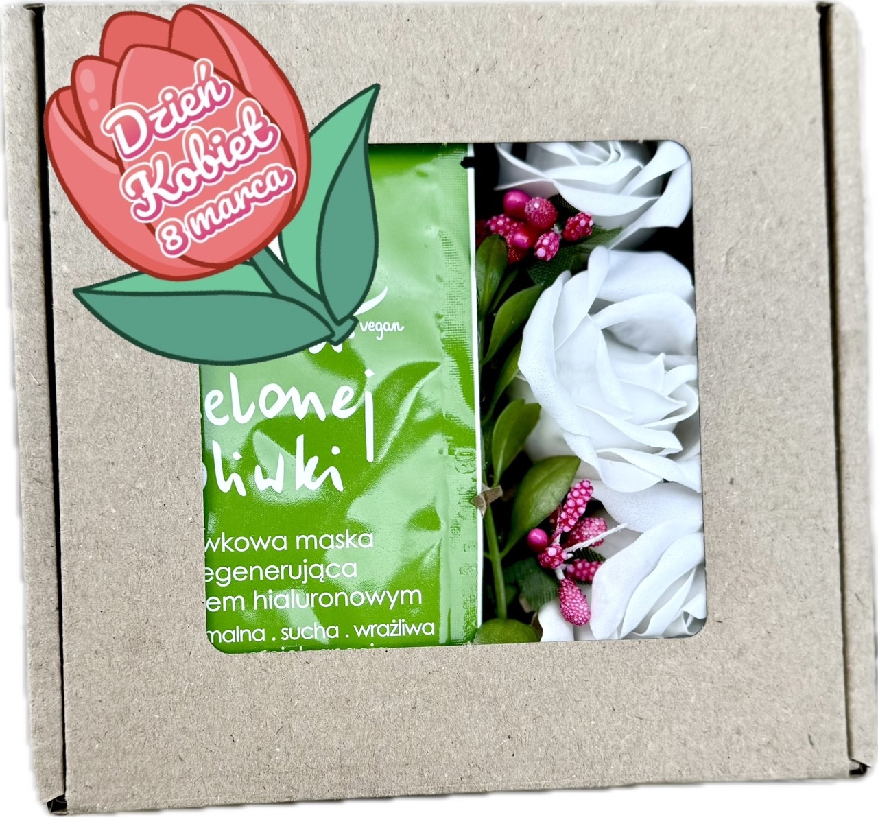 - pudełko z okienkiem i naklejką w kształcie tulipana z napisem "Dzień Kobiet 8 Marca", rozmiar 13x13 cm.