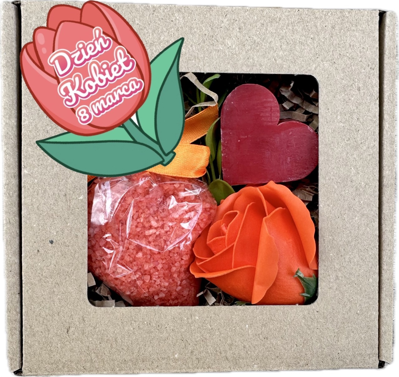 - pudełko z okienkiem i naklejka w kształcie tulipana z napisem "Dzień Kobiet 8 Marca", rozmiar 13x13 cm.