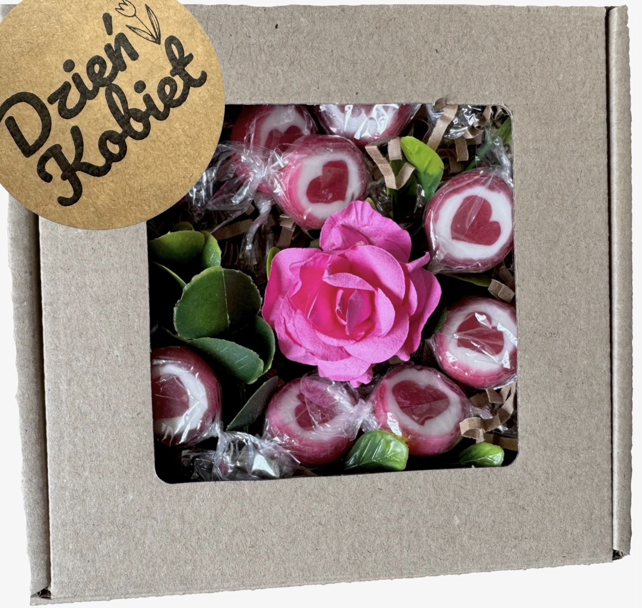 - box prezentowy z napisem "Dzień Kobiet", pudełko z okienkiem o rozmiarze 13x13 cm,