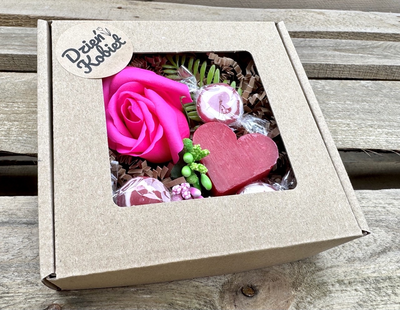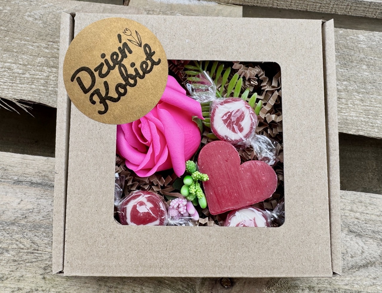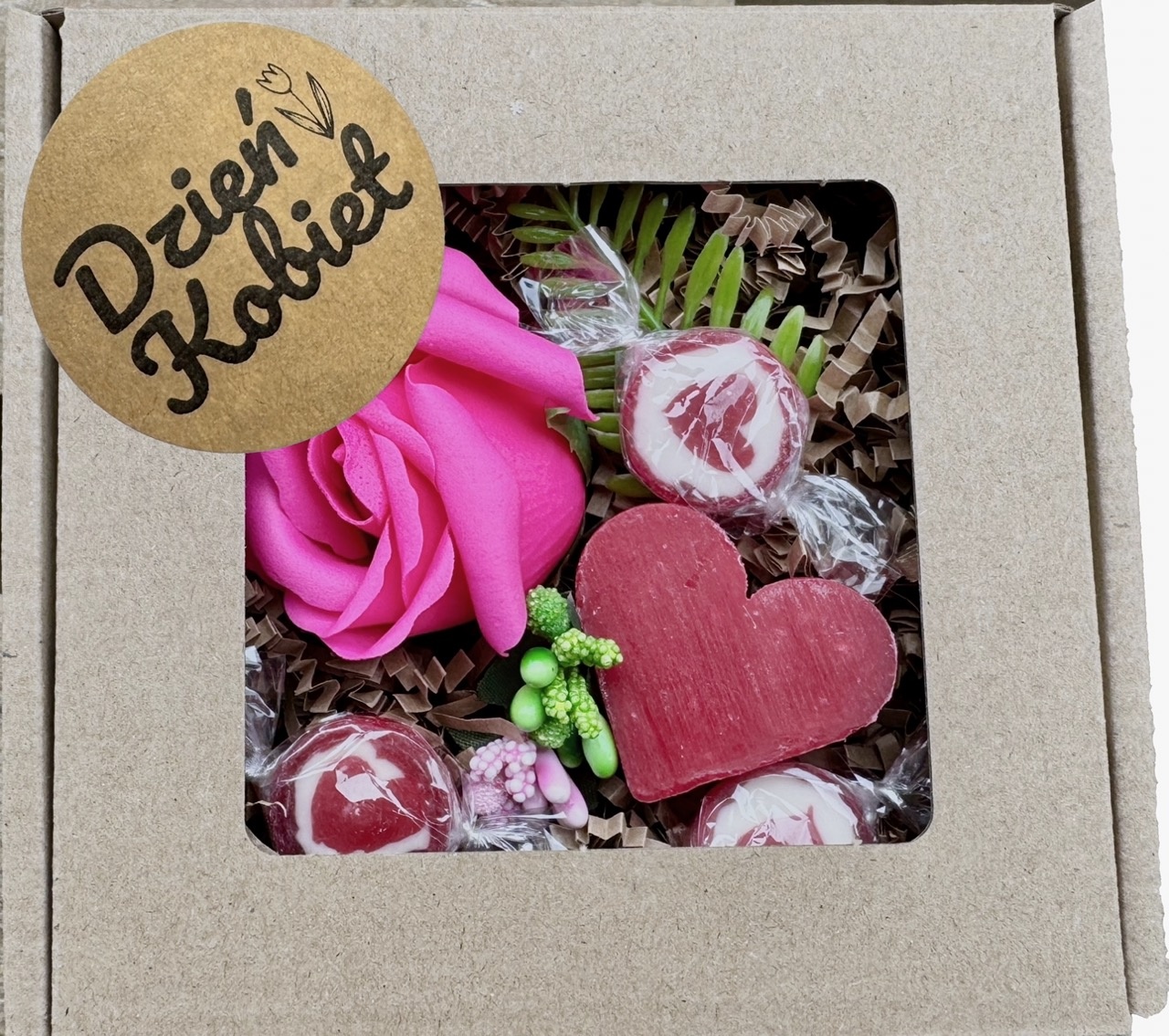 - pudełko z okienkiem i napisem "Dzień Kobiet", rozmiar 13x13 cm.