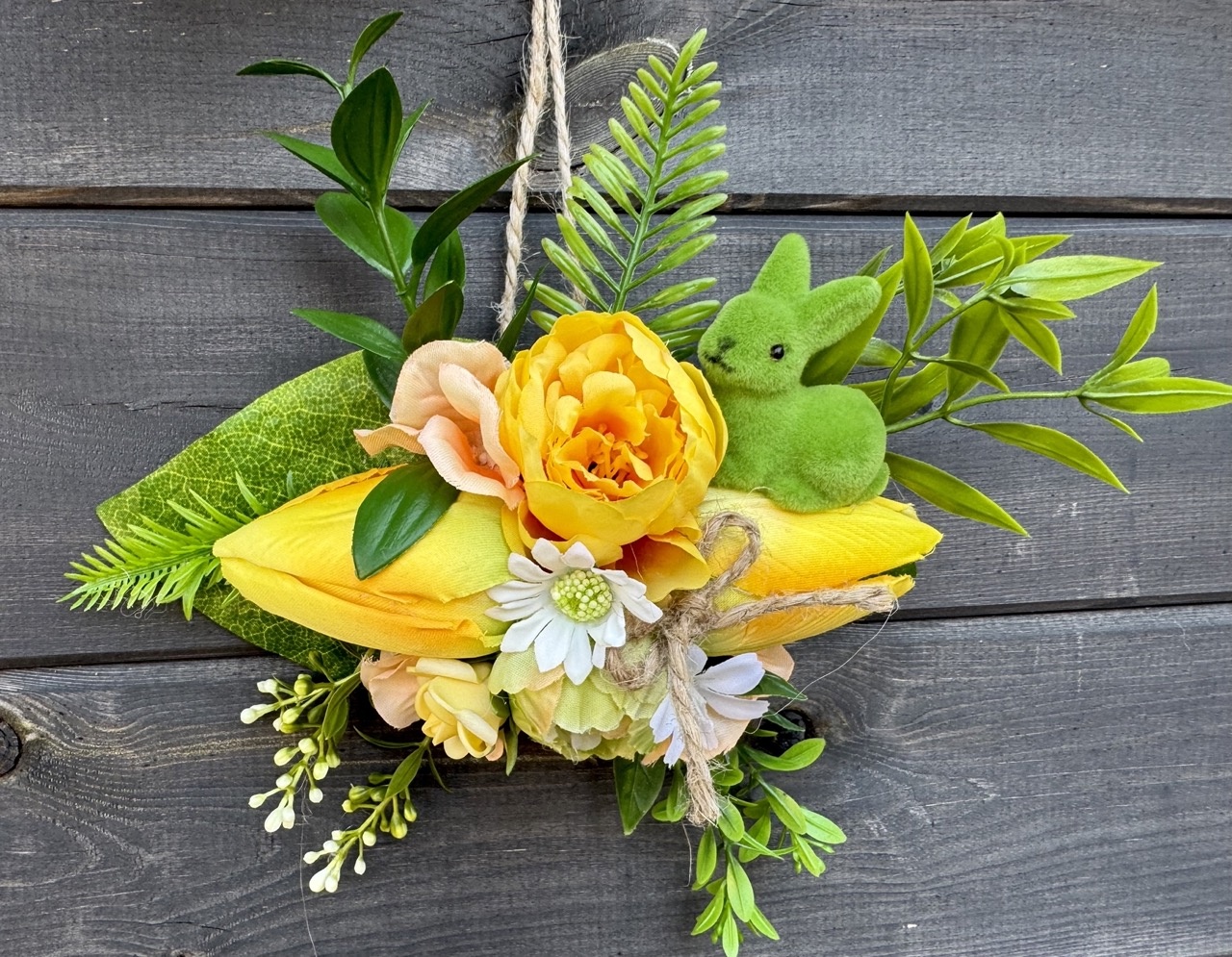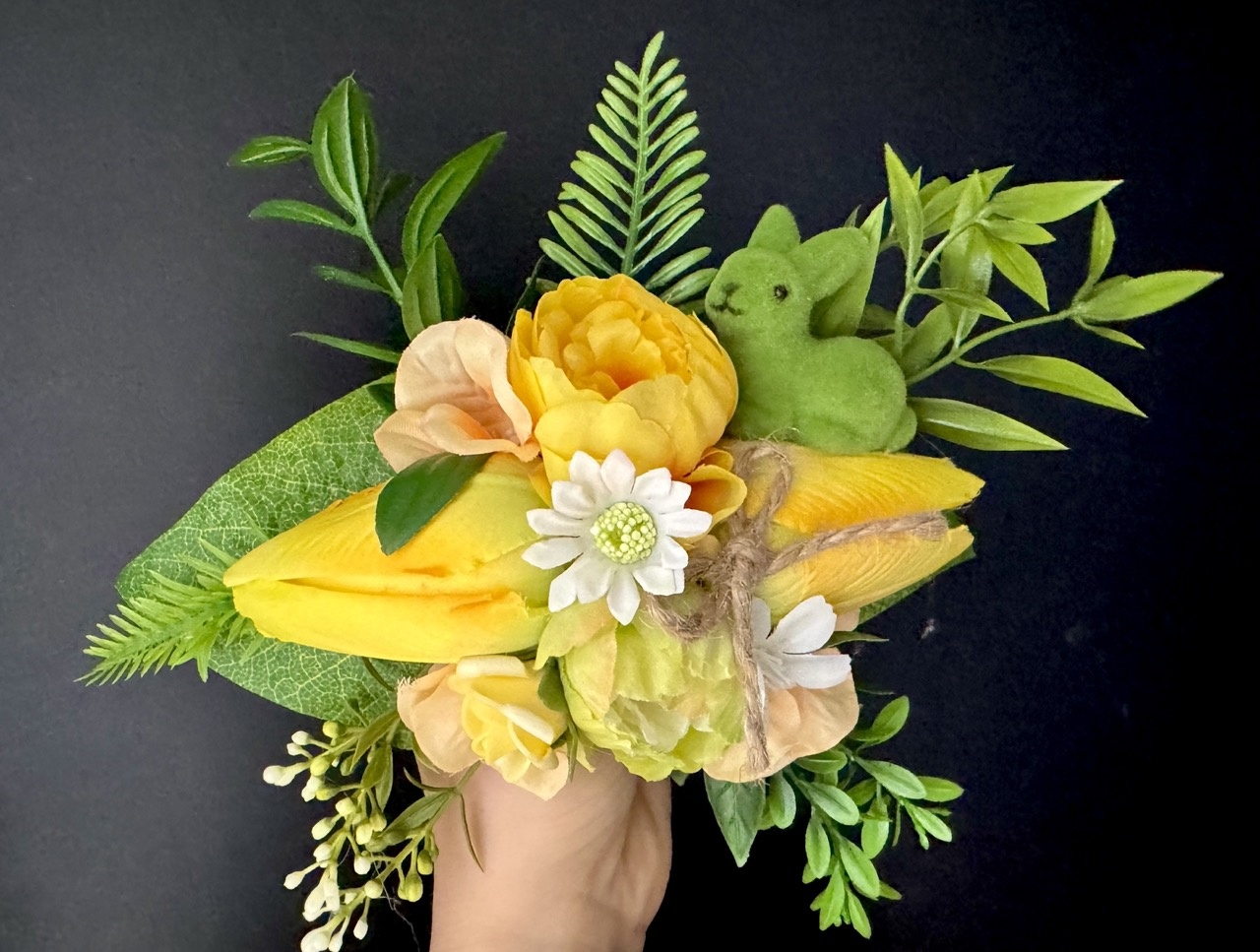 - w skład dekoracji wchodzą dodatki zielone, kwiaty, króliczek,