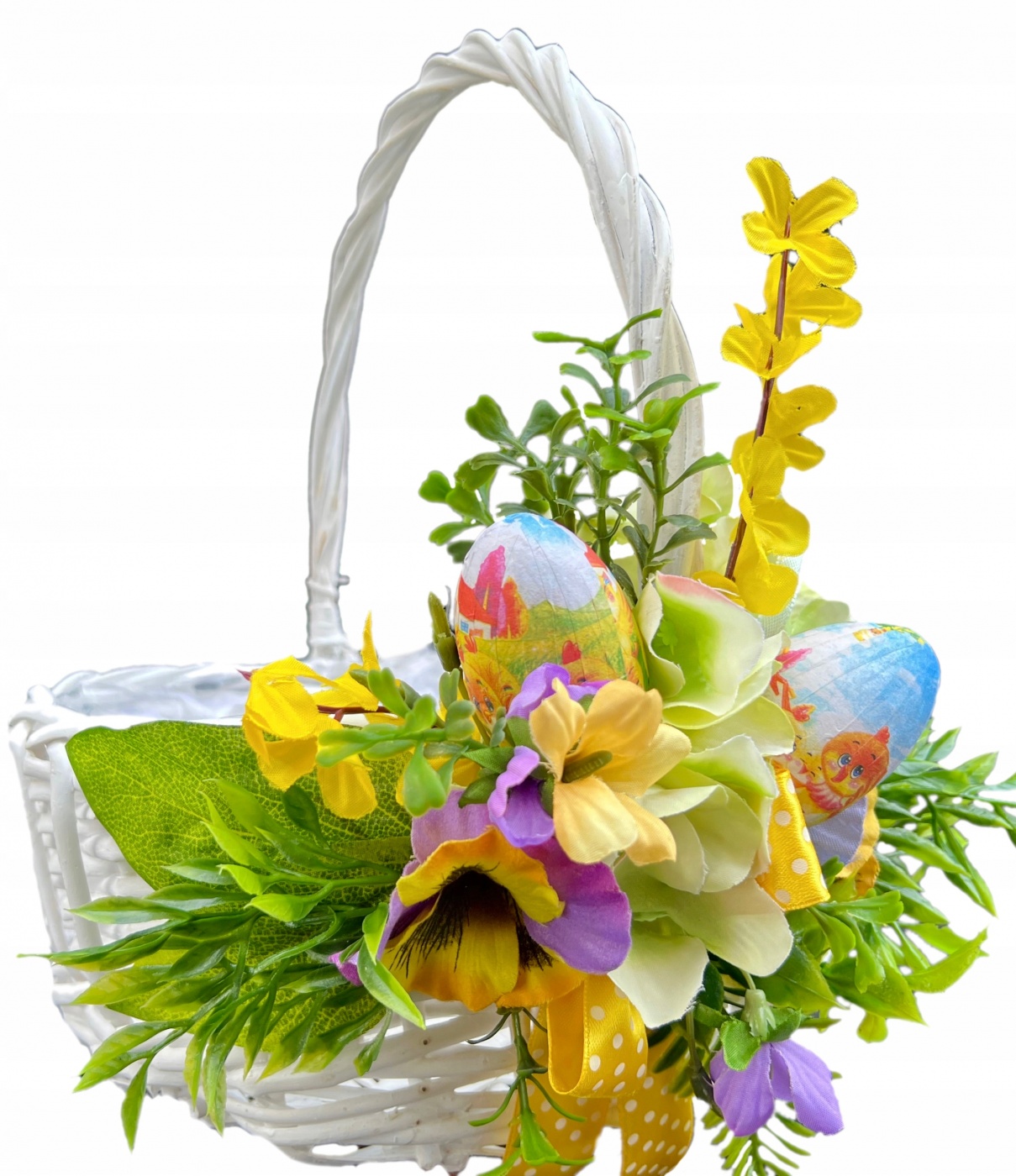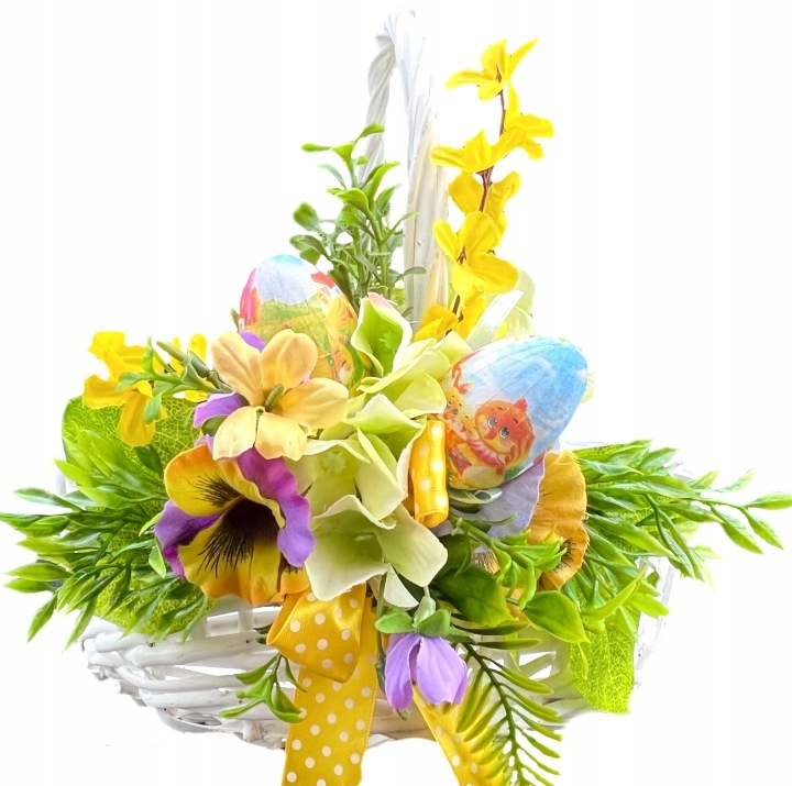 - w skład dekoracji wchodzą dodatki zielone, kwiaty, kolorowe jajka styropianowe, wstążki,