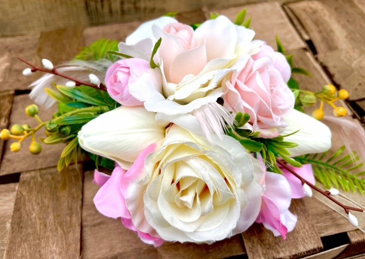 - w skład dekoracji wchodzą dodatki zielone, kwiaty, bazie, , wstążki, piórka,
