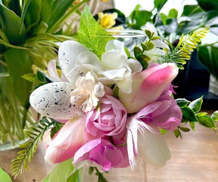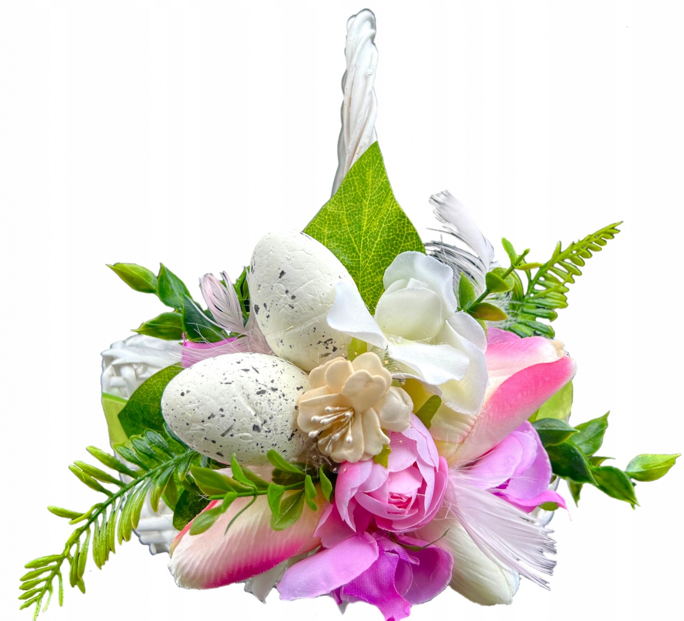 - w skład dekoracji wchodzą dodatki zielone, kwiaty, jajka styropianowe, wstążki, piórka,
