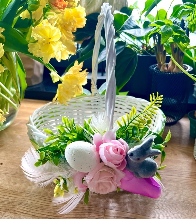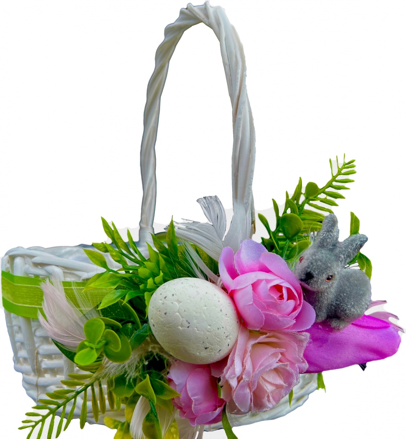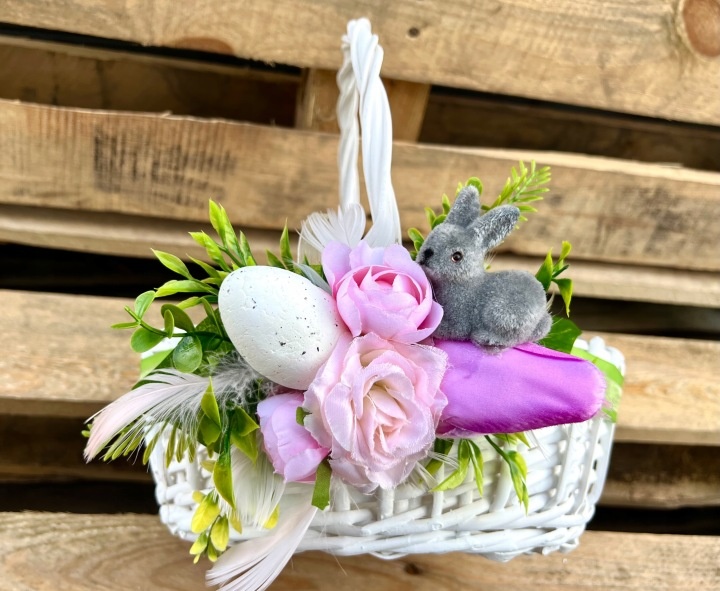 - w skład dekoracji wchodzą dodatki zielone, kwiaty, jajka styropianowe, zajączek flokowany, wstążki,