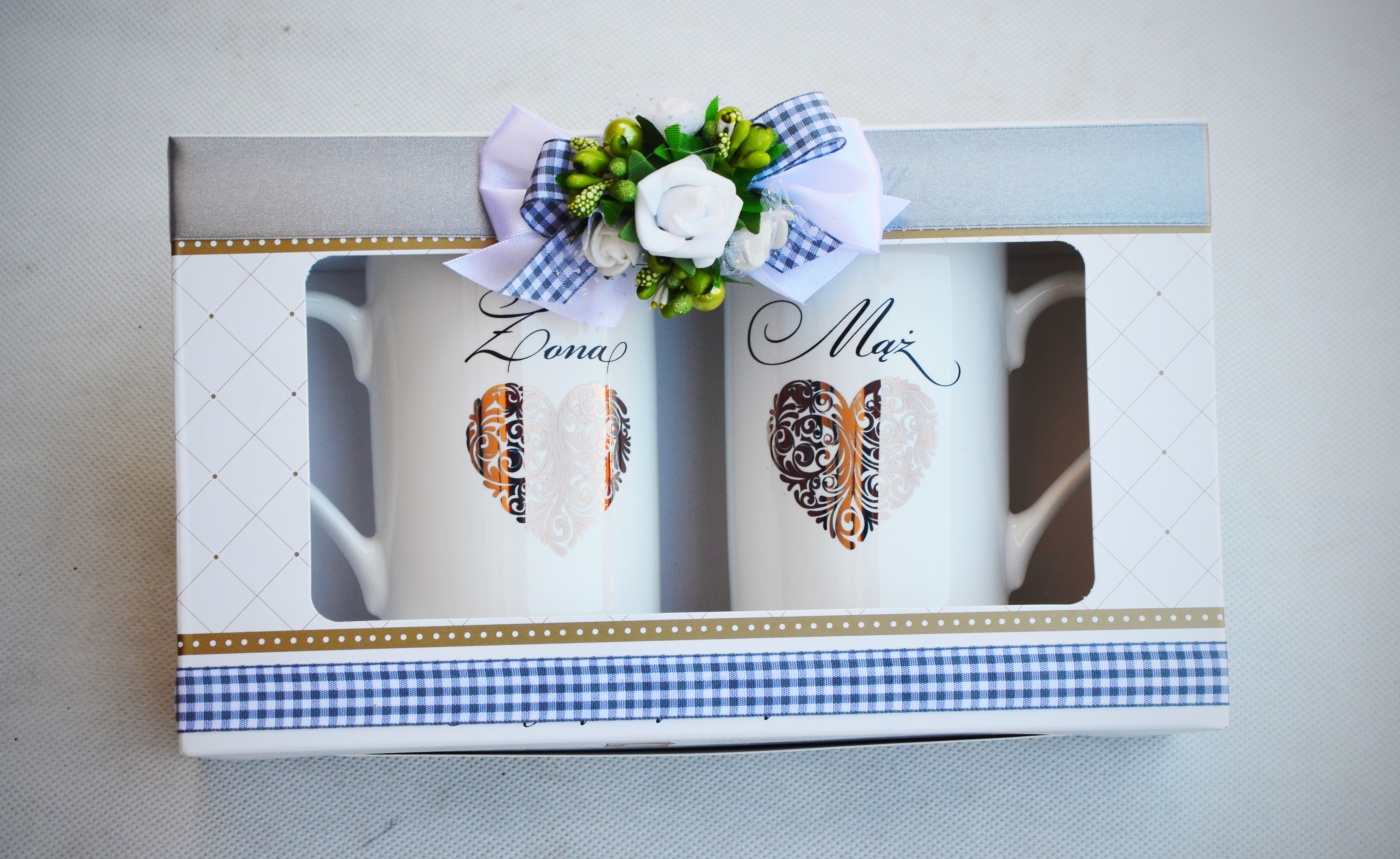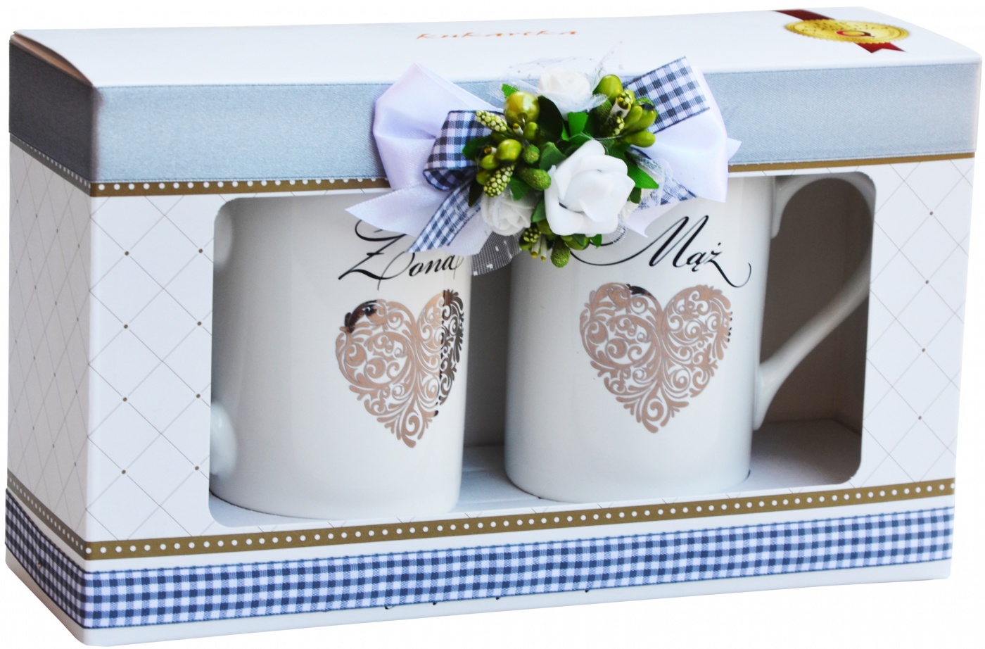 - komplet eleganckich kubków ceramicznych o pojemności 280 ml z napisem: Żona + serce, Mąż + serce w oryginalnym, ozdobnym pudełku,