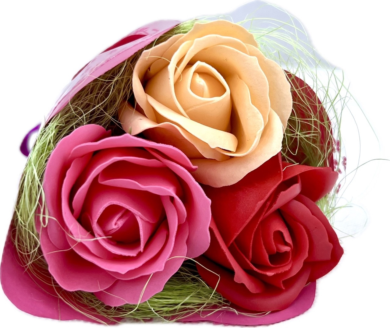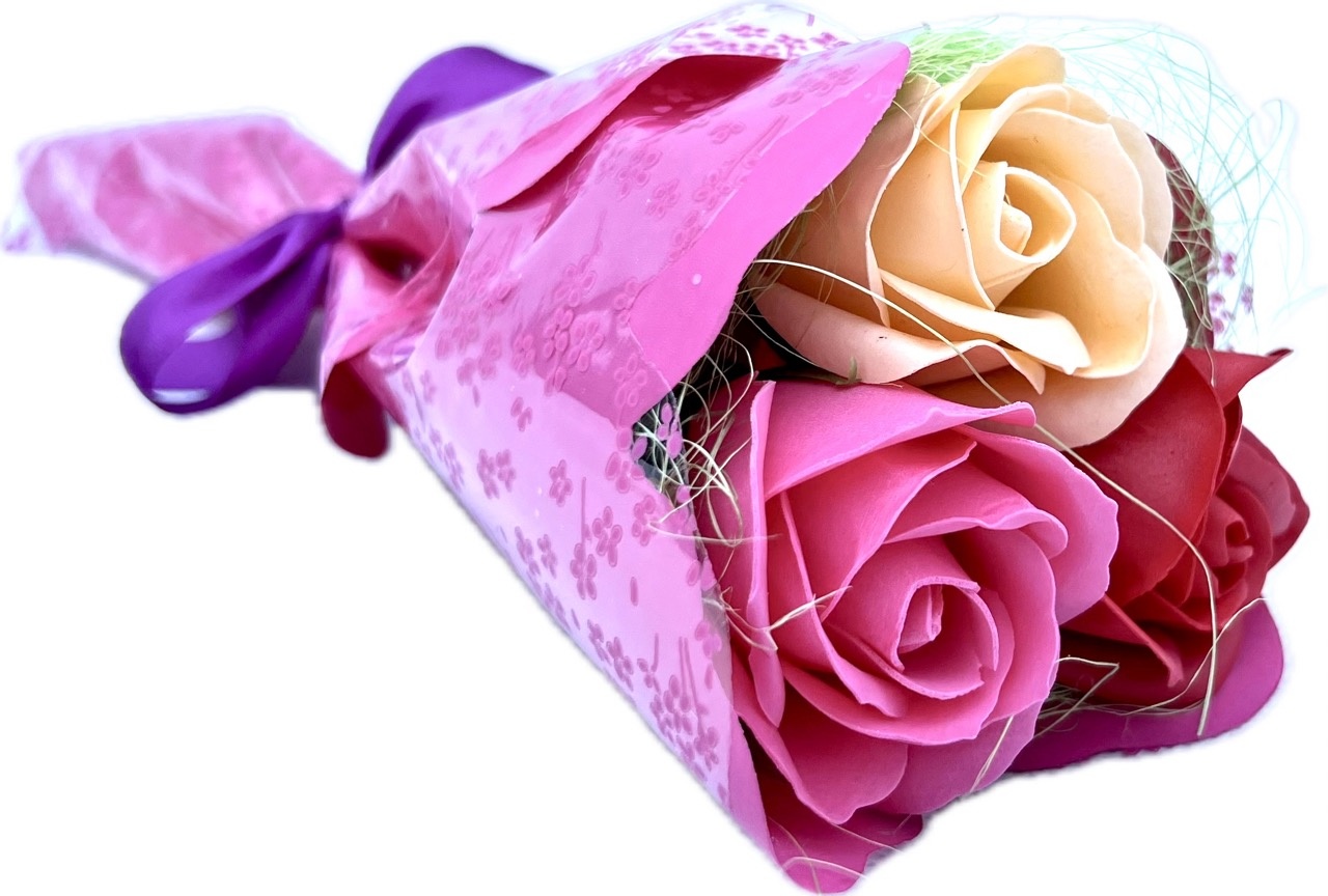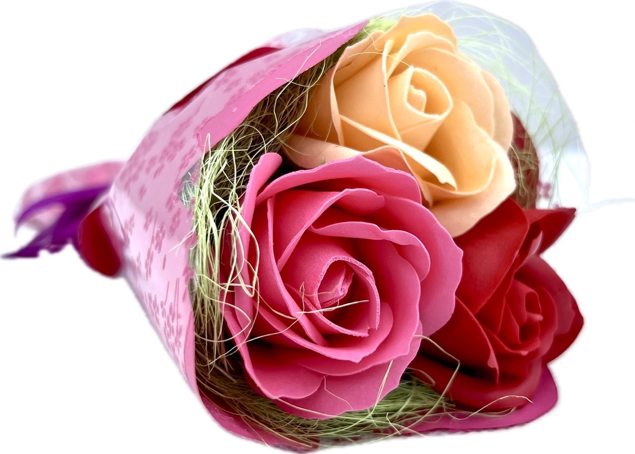 Wyjątkowy, oryginalny, piękny bukiet, który zachwyci każdą obdarowaną osobę. Bukiet wykonany jest z 3 pięknych pachnących róż mydlanych.