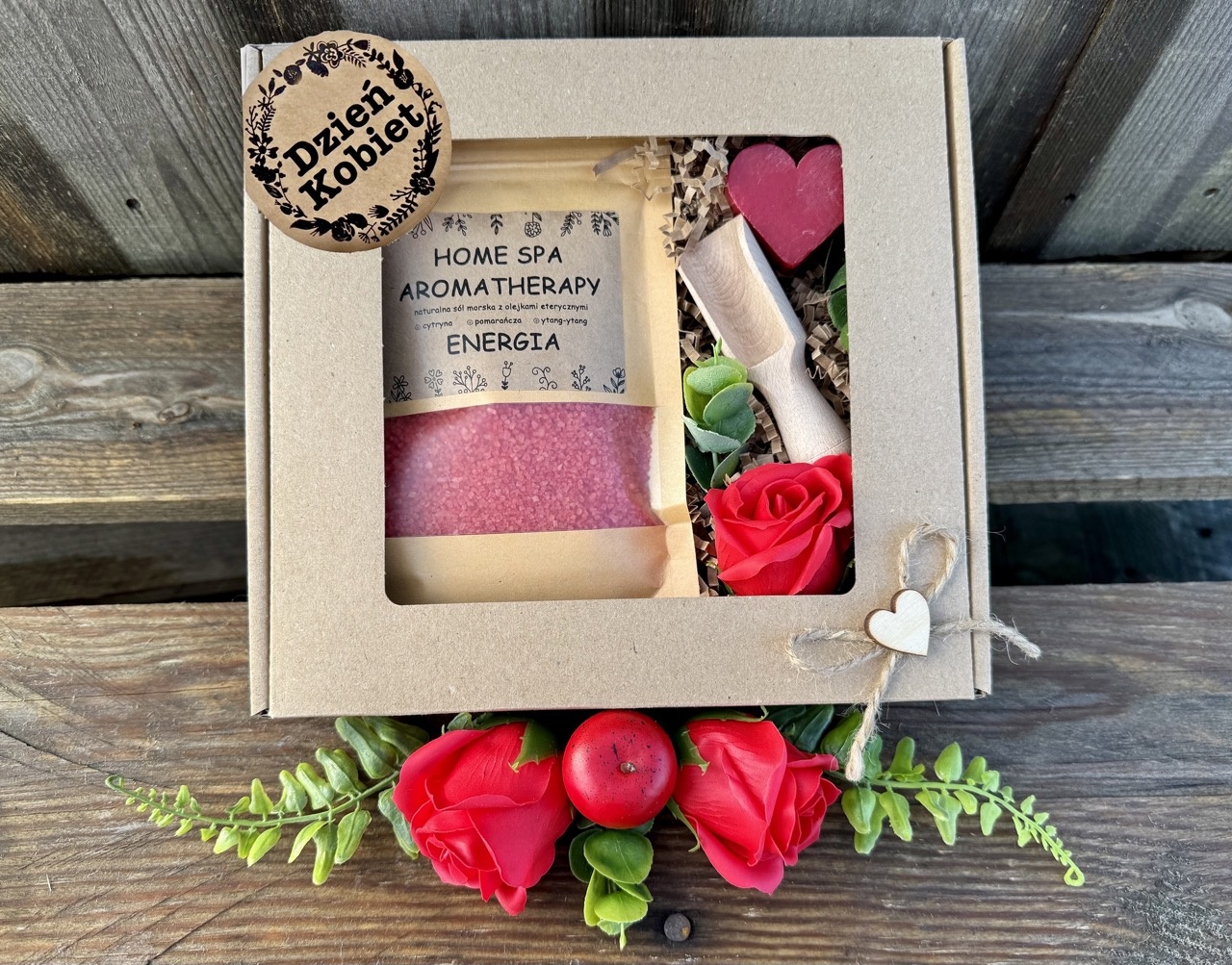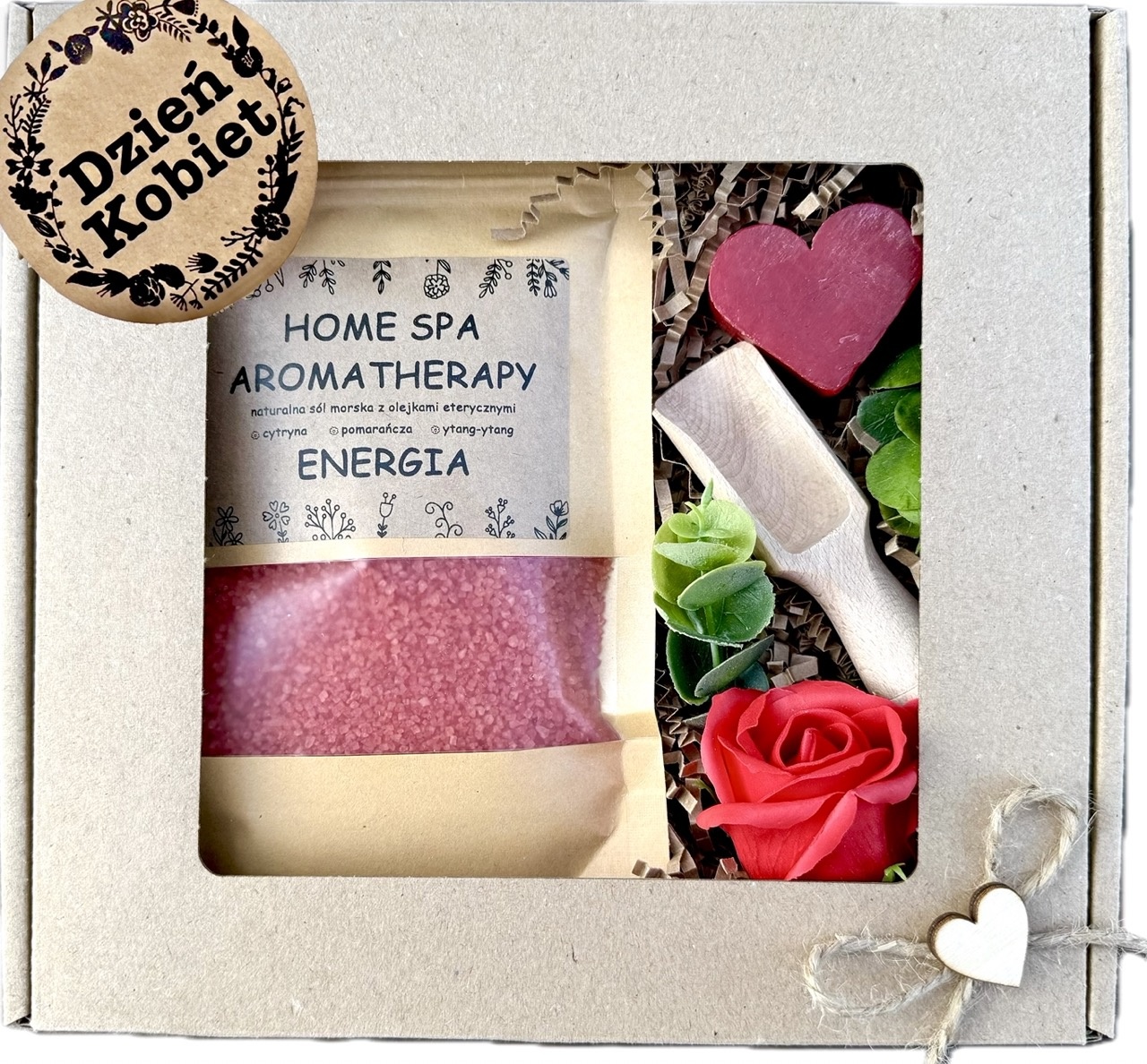 - całość ładnie pakowana w elegancki kartonik z okienkiem, rozmiar 20x20x5 cm, naklejka wSPAniałych Walentynek.
