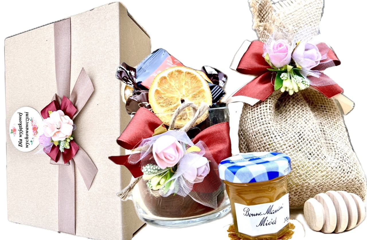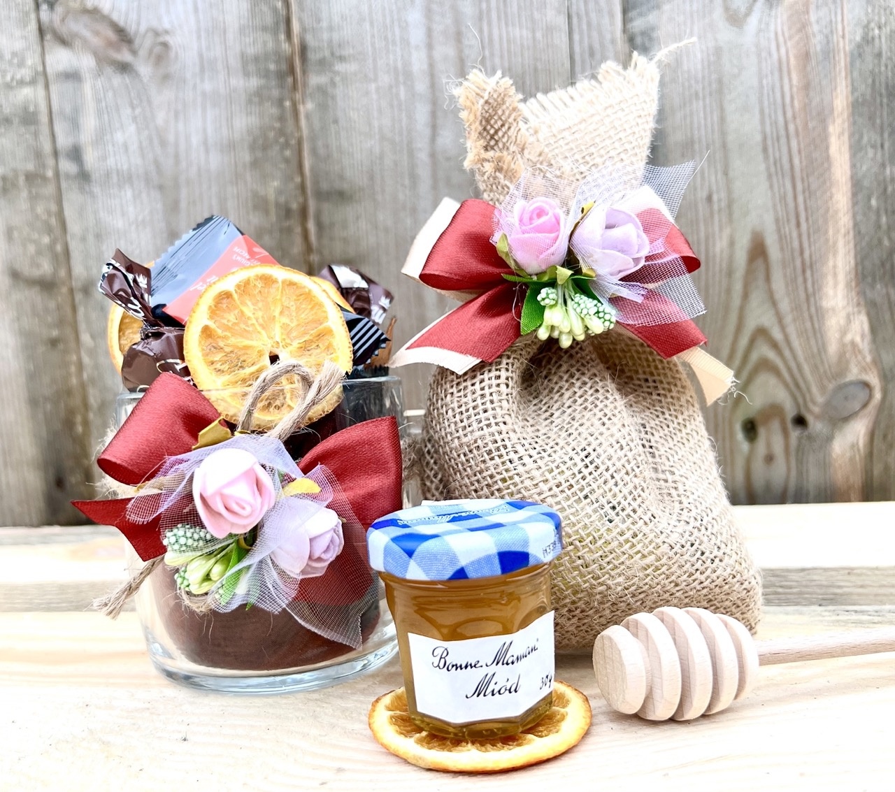 - zestaw 5 herbat w różnych smakach w naturalnym opakowaniu z juty z ozdobą kwiatową,