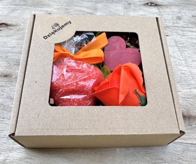 - pudełko z okienkiem i napisem, rozmiar 13x13 cm.