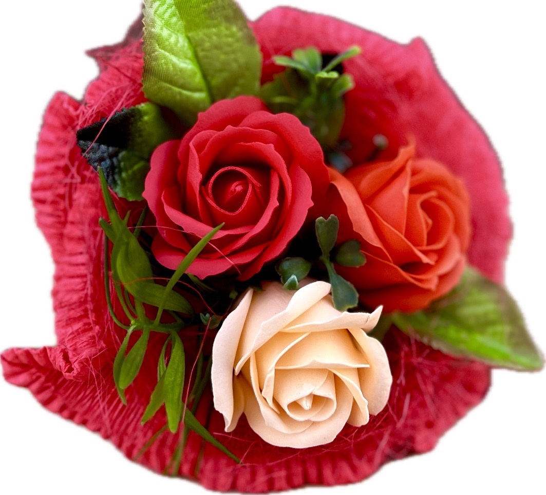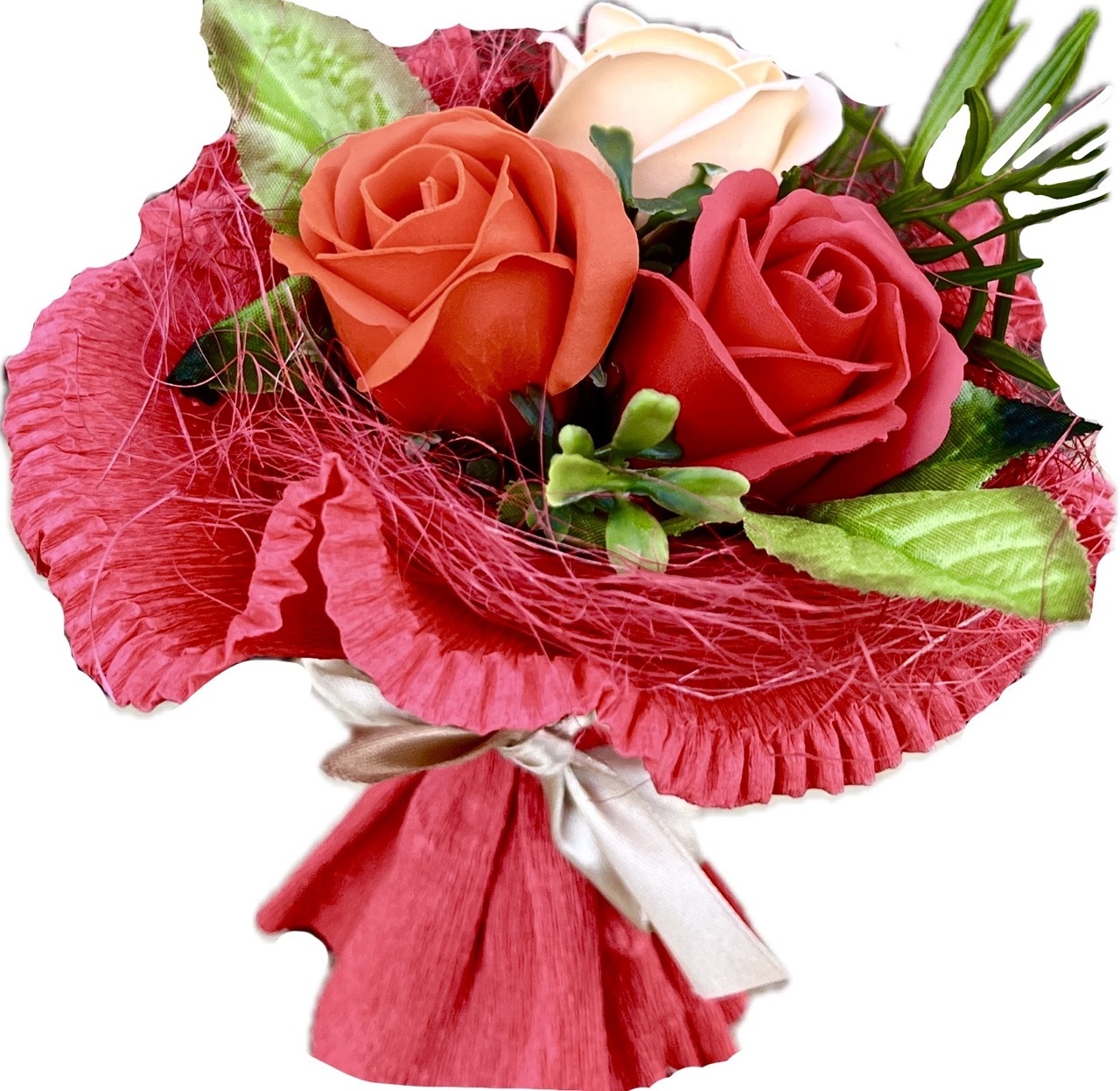 ❤️ piękne pachnące, duże mydlane kwiaty w odcieniach czerwieni i pomarańczy w otoczeniu ozdobnego sizalu i sztucznych dodatków zielonych, całkowita wysokość i średnica to około 18 - 20 cm,