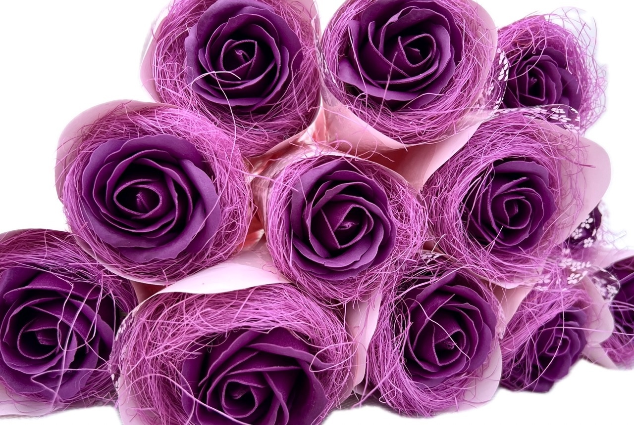 ❤️ piękna pachnąca, duża mydlana róża w kolorze fioletowym w otoczeniu ozdobnego sizalu, całkowita wysokość to 37 cm, wielkość samego pąka róży: 7,5 cm wysokość, 6 cm średnica,
