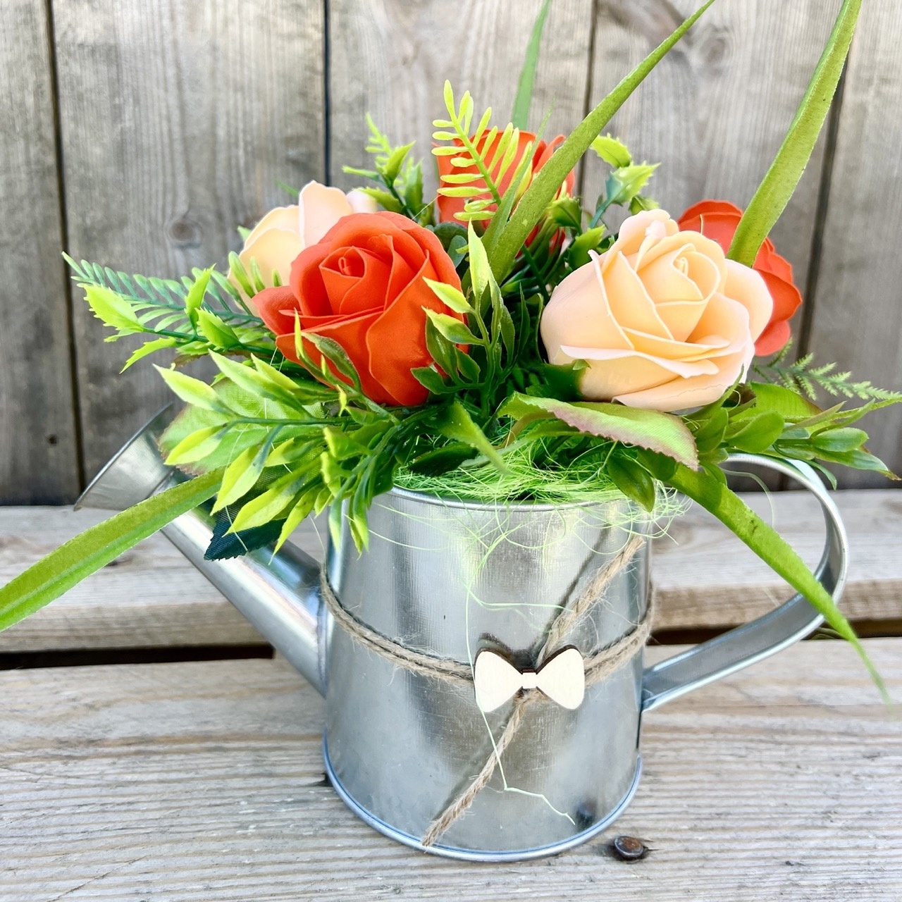 - kompozycja umieszczona w metalowej konewce: wysokość 10 cm, szerokość całkowita 23 cm,