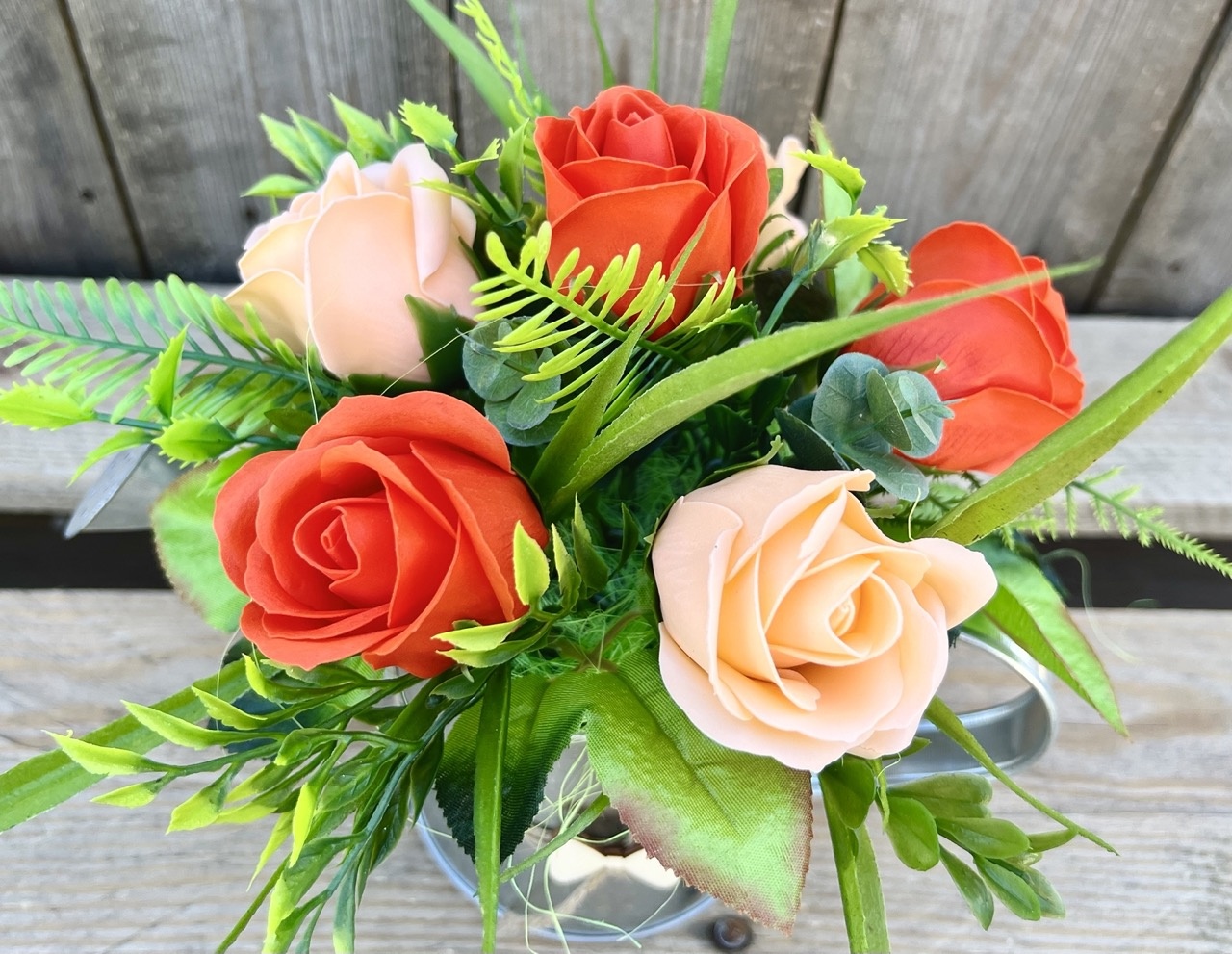 - bukiet wykonany z kwiatów mydlanych w kolorystyce pomarańczowej