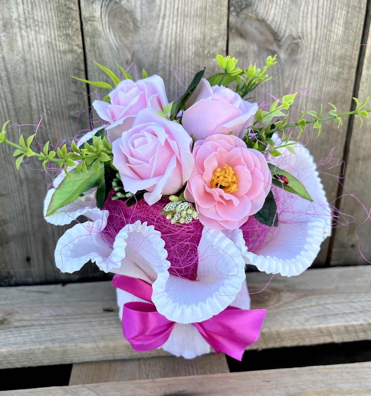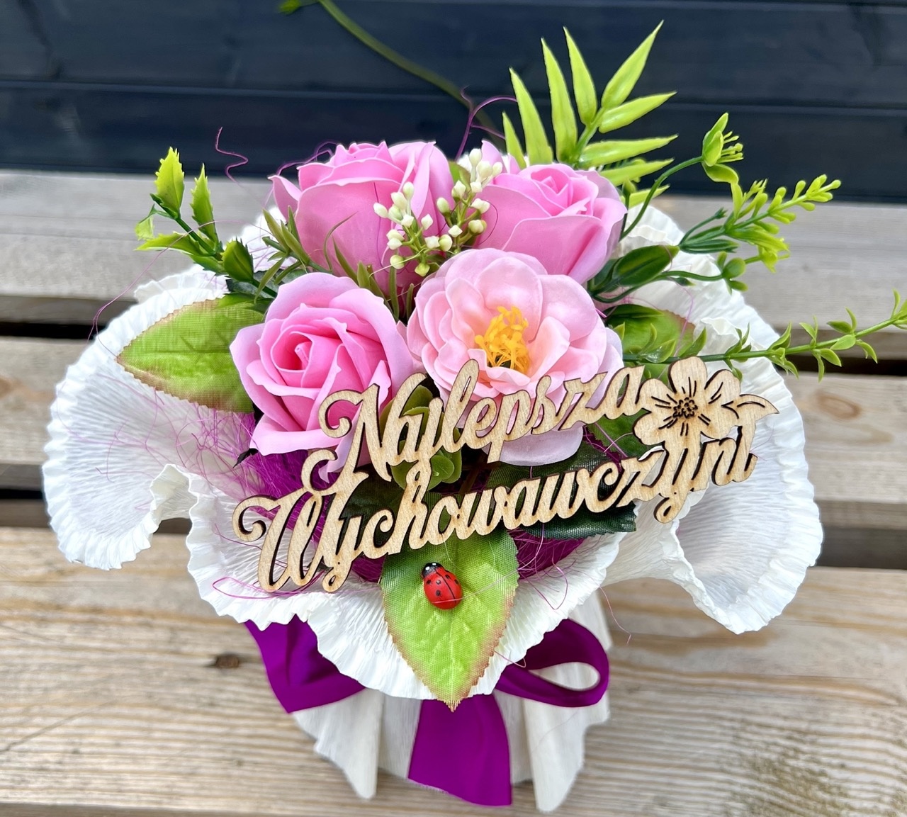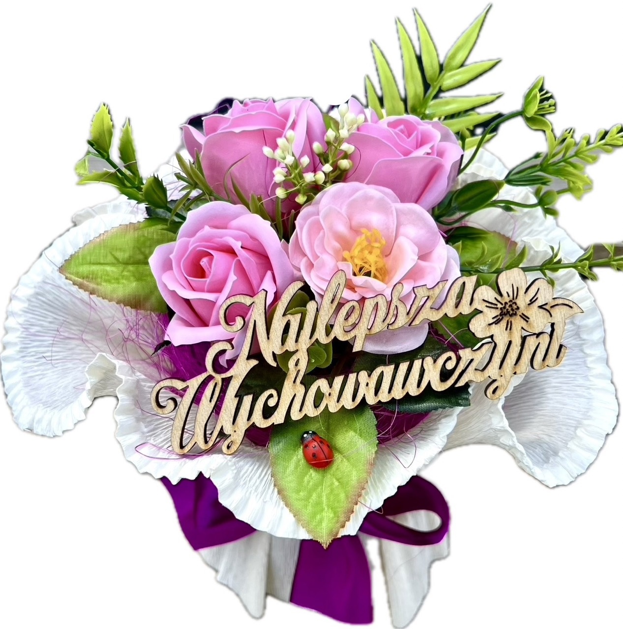 Otrzymujesz uroczy prezent gotowy do wręczenia! Mydlany bukiet zachwyci każdą wychowawczynię, nauczycielkę, pani dyrektor swoim wyglądem i zapachem.