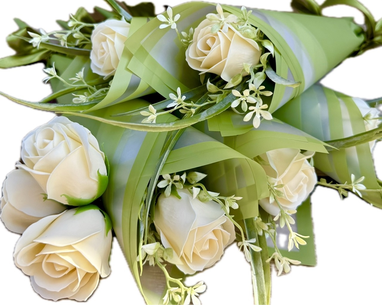 ❤️ piękna pachnąca, duża mydlana róża w kolorze ECRU w otoczeniu zielonych dodatków - całość wygląda bardzo naturalnie. Całkowita wysokość to 37 cm, wielkość samego pąka róży: 6,5 cm wysokość, 6 cm średnica,