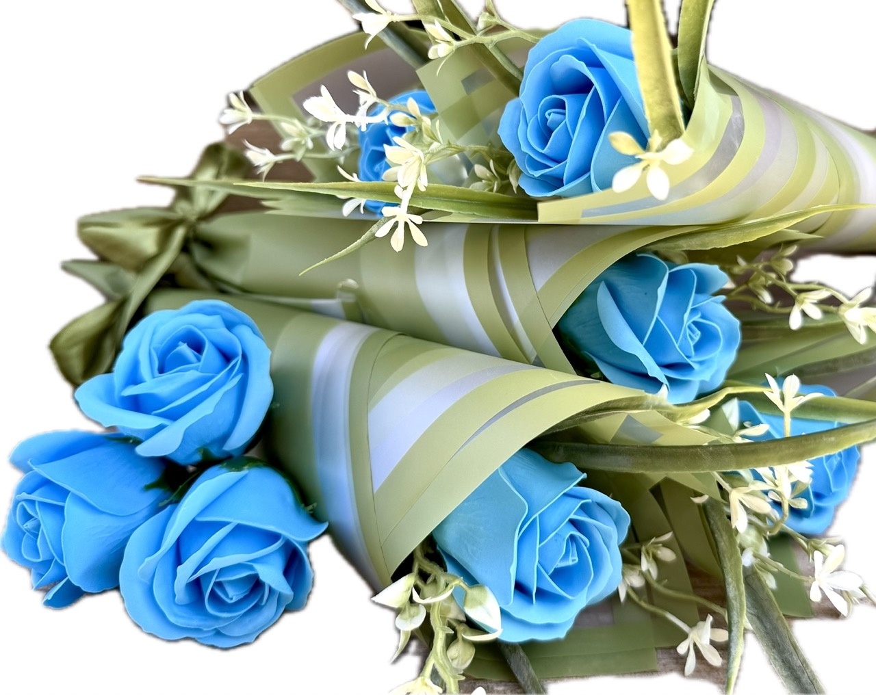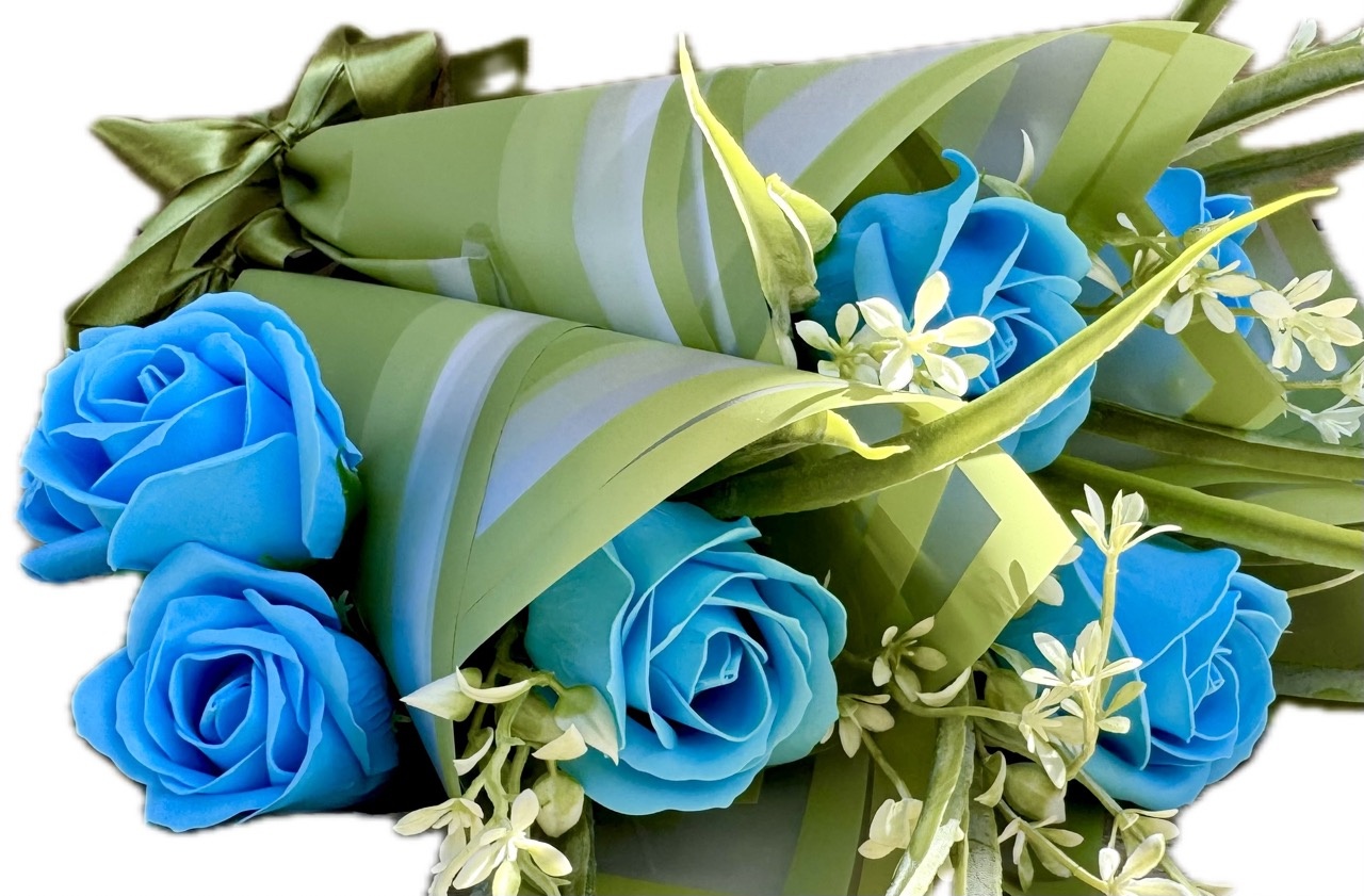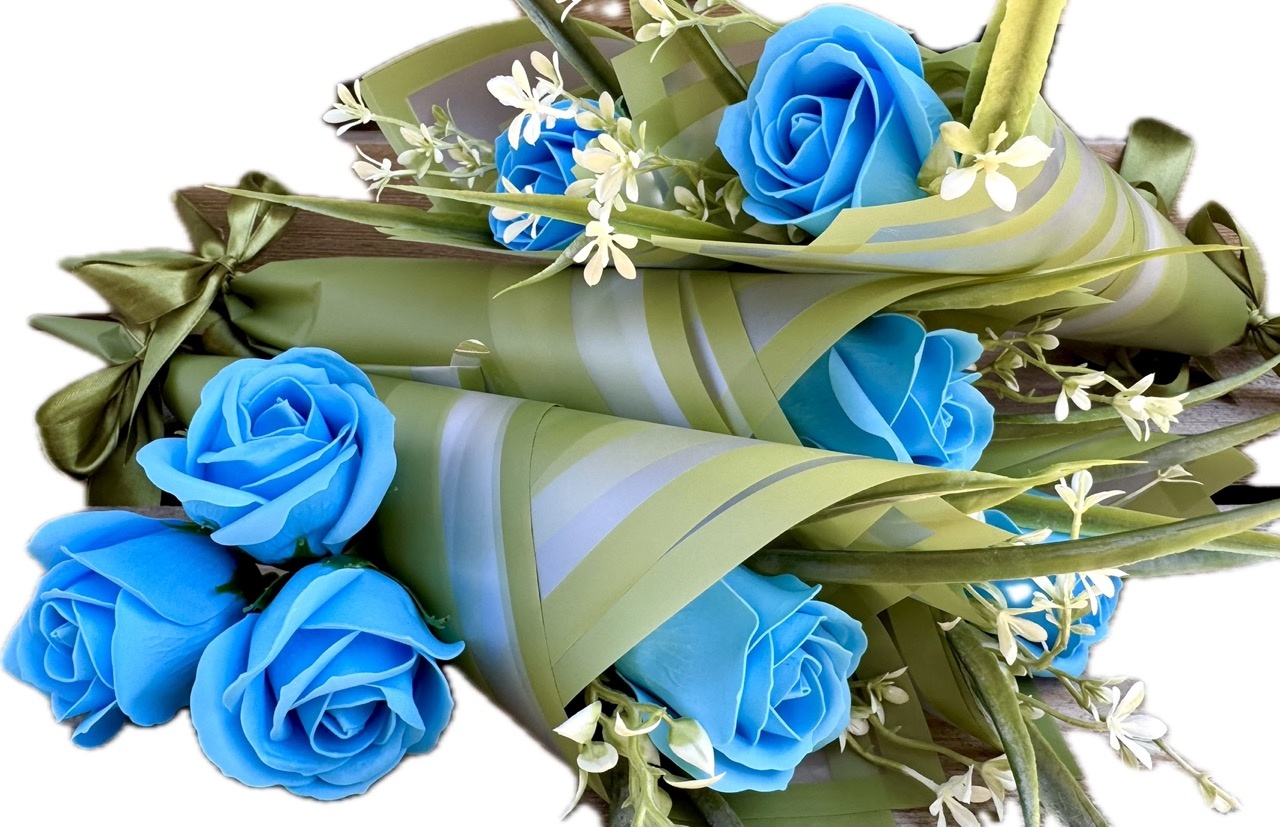 ❤️ piękna pachnąca, duża mydlana róża w kolorze NIEBIESKIM w otoczeniu zielonych dodatków - całość wygląda bardzo naturalnie. Całkowita wysokość to 37 cm, wielkość samego pąka róży: 6,5 cm wysokość, 6 cm średnica,