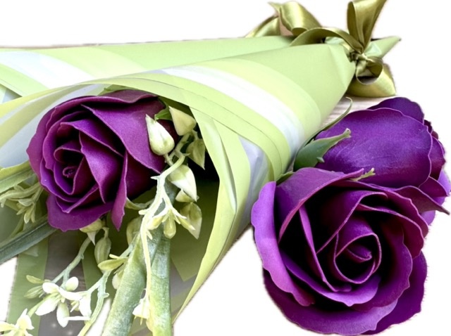 ❤️ piękna pachnąca, duża mydlana róża w kolorze FIOLETU w otoczeniu zielonych dodatków - całość wygląda bardzo naturalnie. Całkowita wysokość to 37 cm, wielkość samego pąka róży: 6,5 cm wysokość, 6 cm średnica,