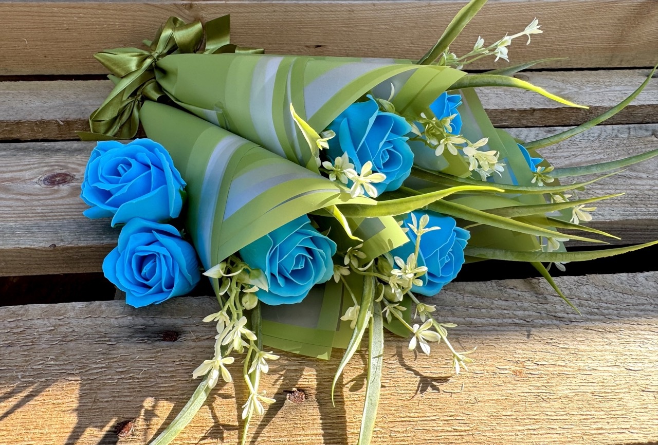 ❤️ piękna pachnąca, duża mydlana róża w kolorze NIEBIESKIM w otoczeniu zielonych dodatków - całość wygląda bardzo naturalnie. Całkowita wysokość to 37 cm, wielkość samego pąka róży: 6,5 cm wysokość, 6 cm średnica,