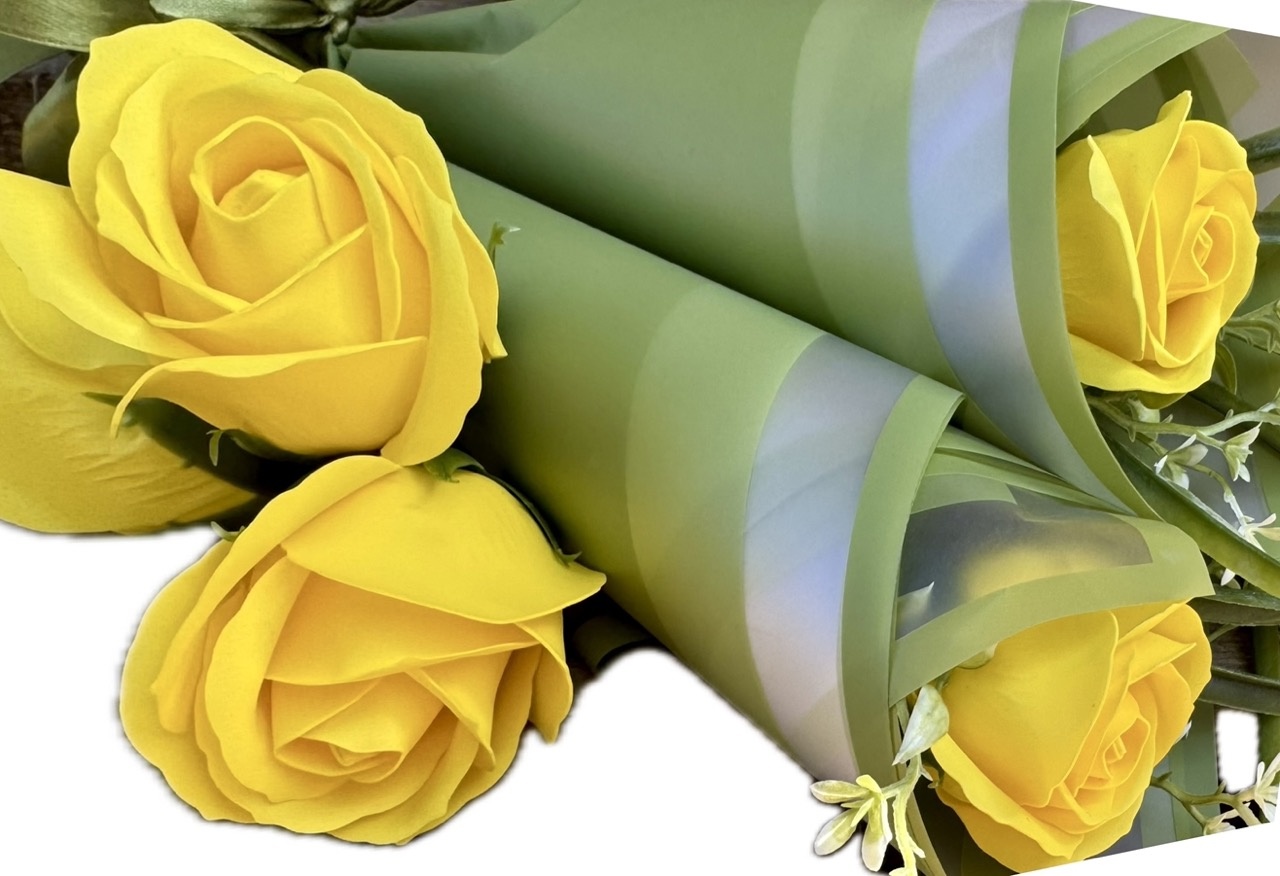 ❤️ piękna pachnąca, duża mydlana róża w kolorze ŻÓŁTYM w otoczeniu zielonych dodatków - całość wygląda bardzo naturalnie. Całkowita wysokość to 37 cm, wielkość samego pąka róży: 6,5 cm wysokość, 6 cm średnica,