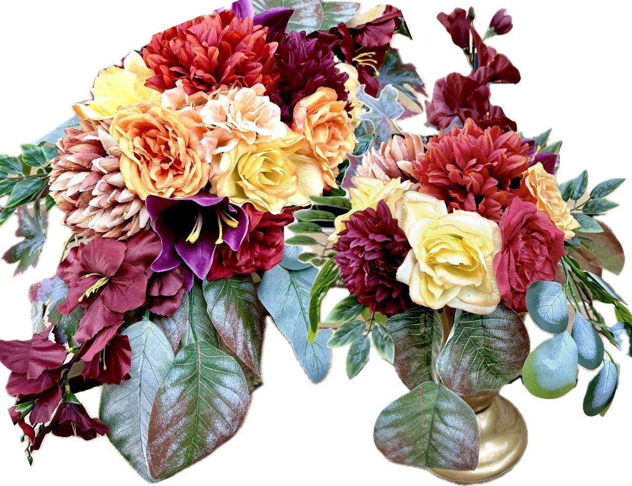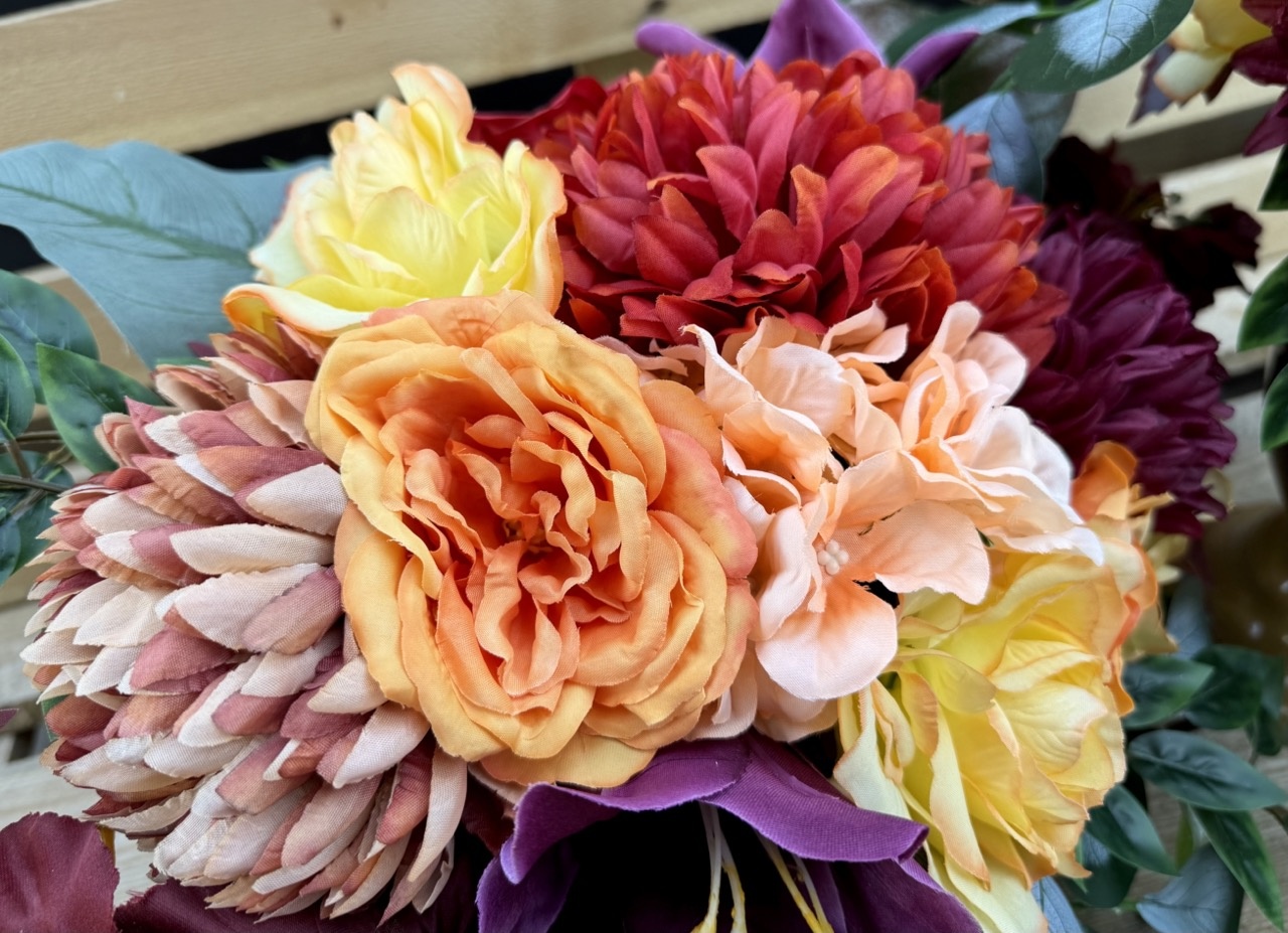 - zestaw kwiatów: chryzantemy, róże, hortensje, gradiole, lilie w odcieniach żółci, pomarańczy, ciemnej czerwieni,