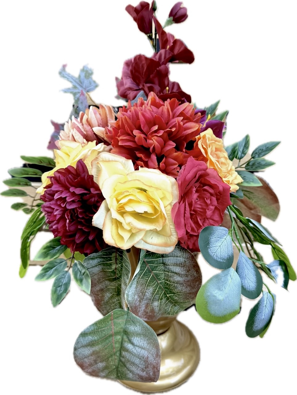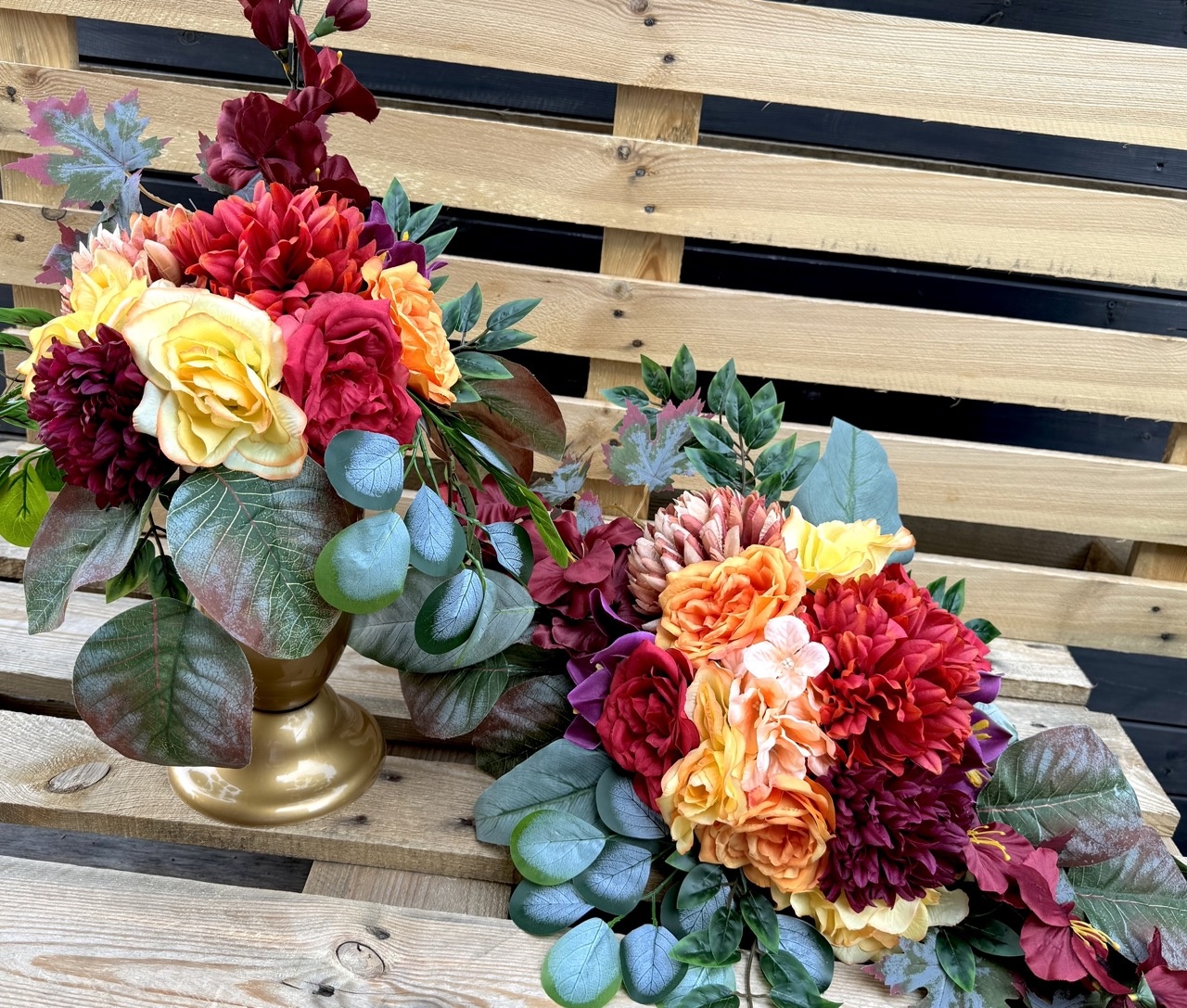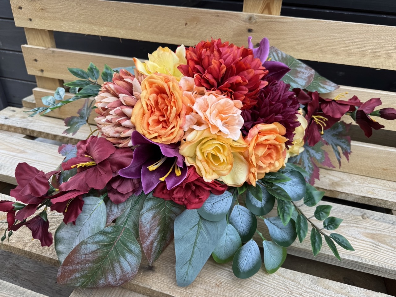 Duża, bogata, piękna wiązanka i bukiet na grób w jesiennych kolorach. Wykonana z kwiatów oraz sztucznych dodatków wysokiej jakości.