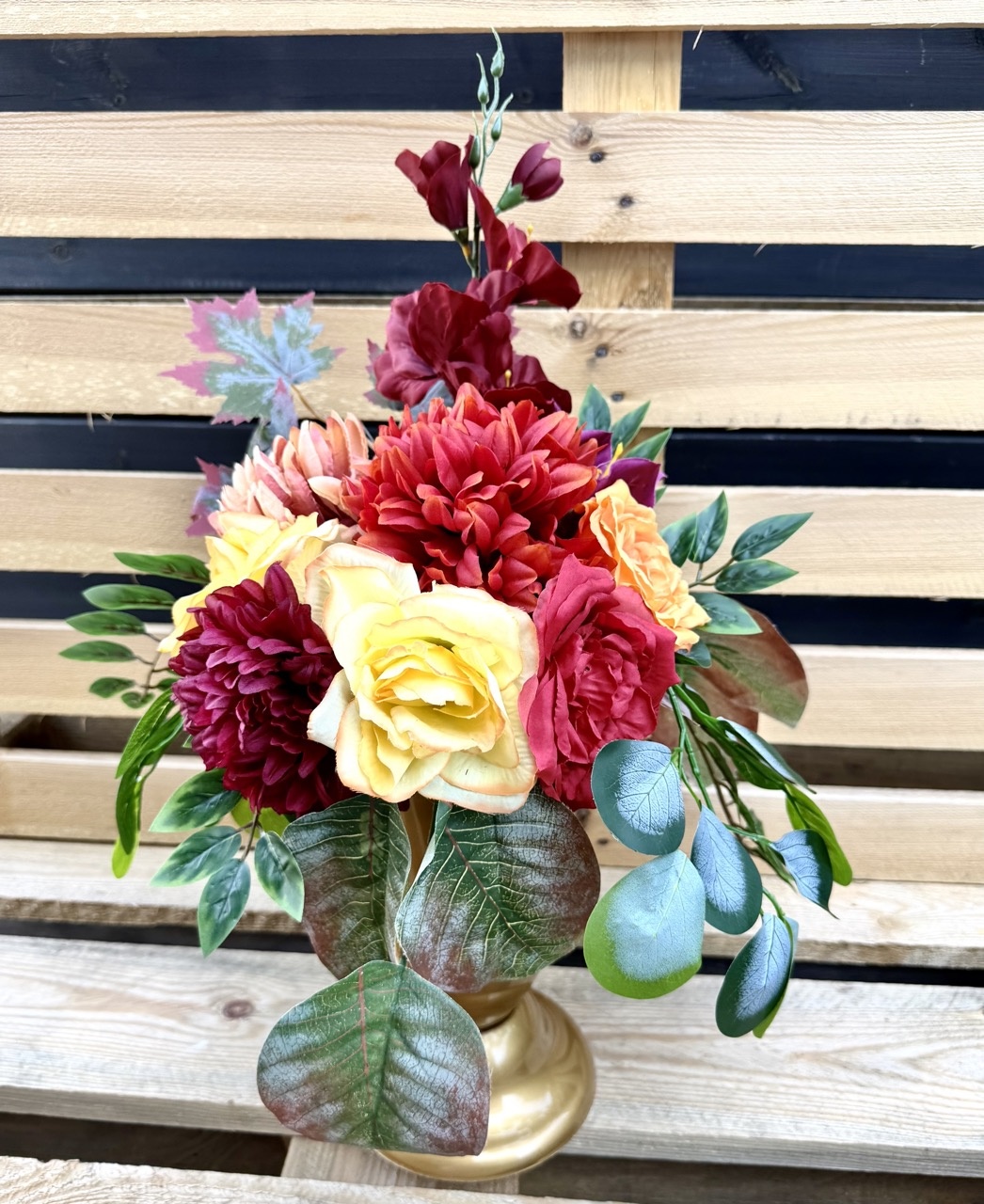 Duży bukiet na grób w jesiennych kolorach. Wykonana z kwiatów oraz sztucznych dodatków wysokiej jakości.