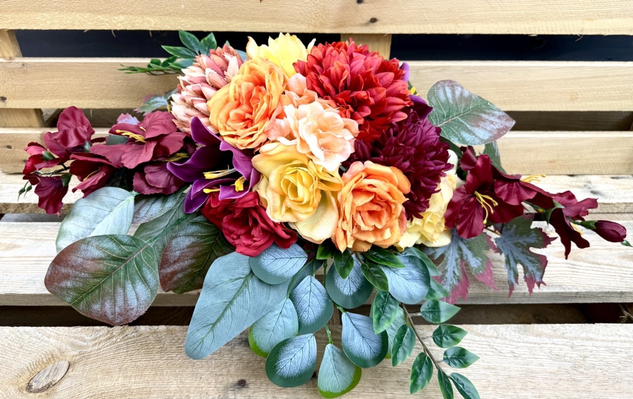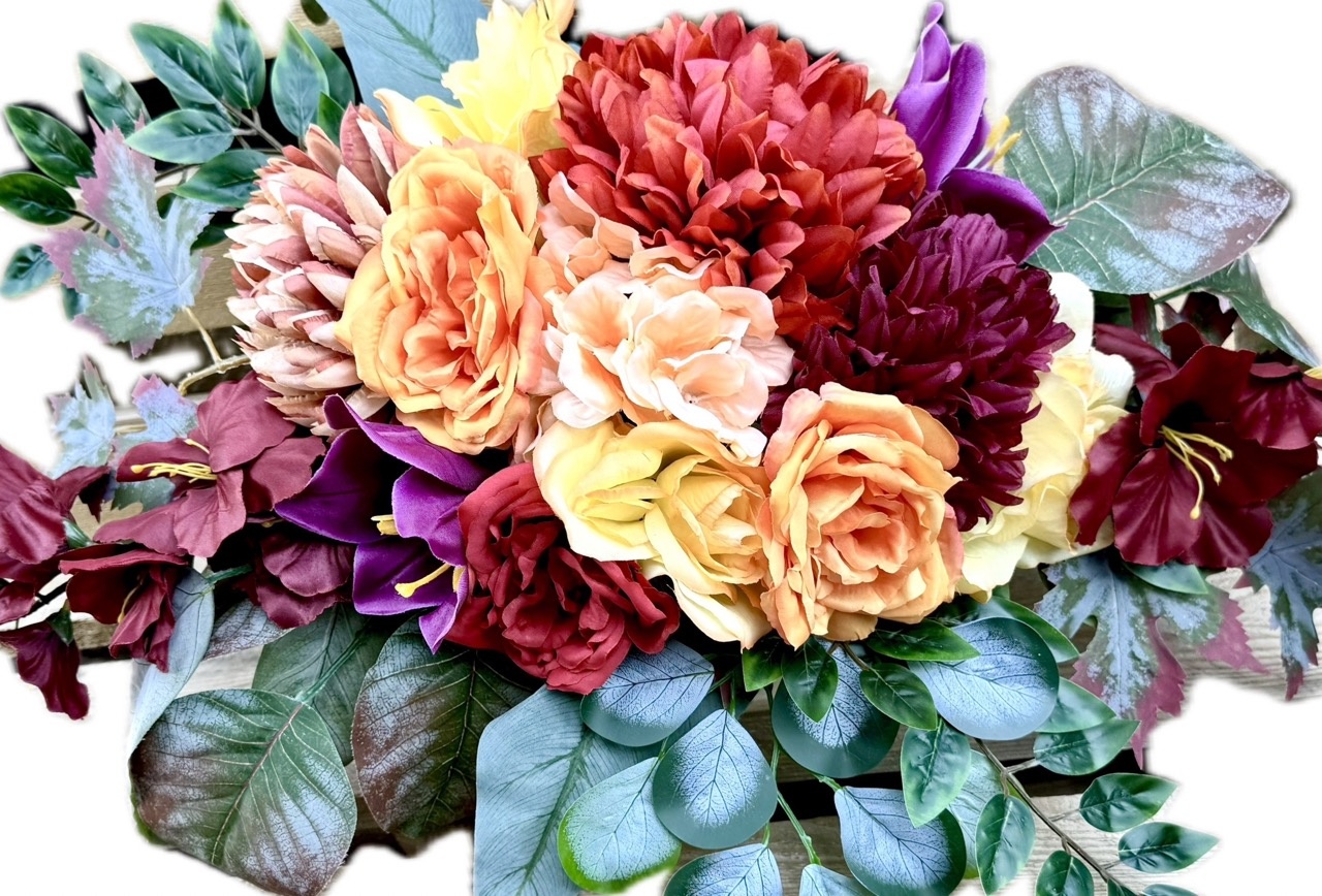 Duża, bogata, piękna wiązanka na grób w jesiennych kolorach. Wykonana z kwiatów oraz sztucznych dodatków wysokiej jakości.