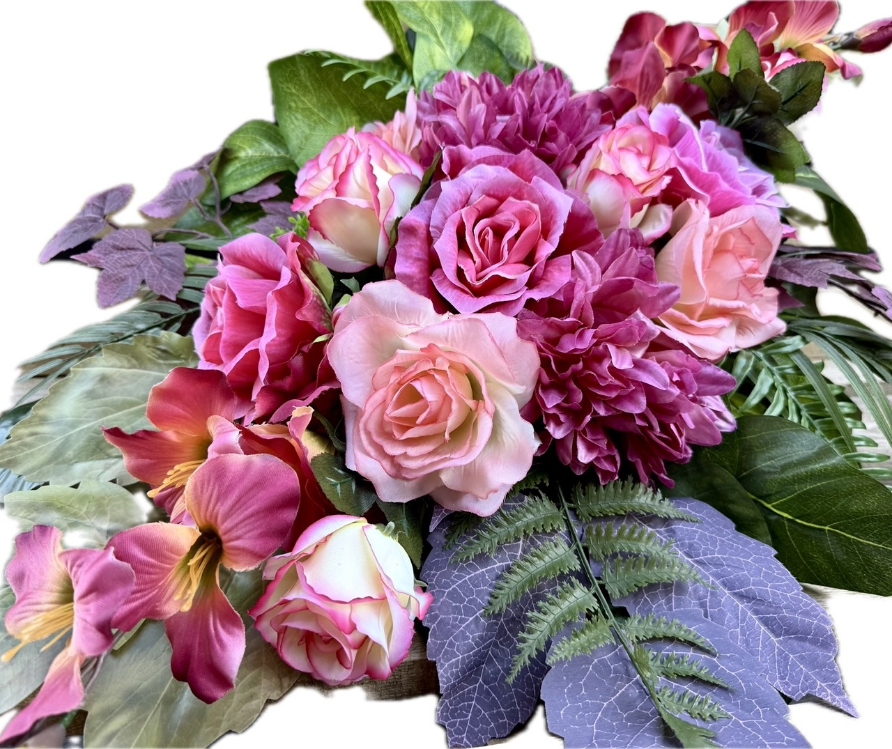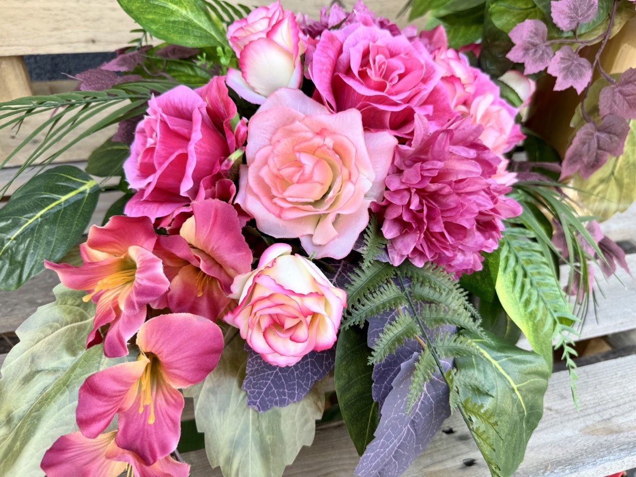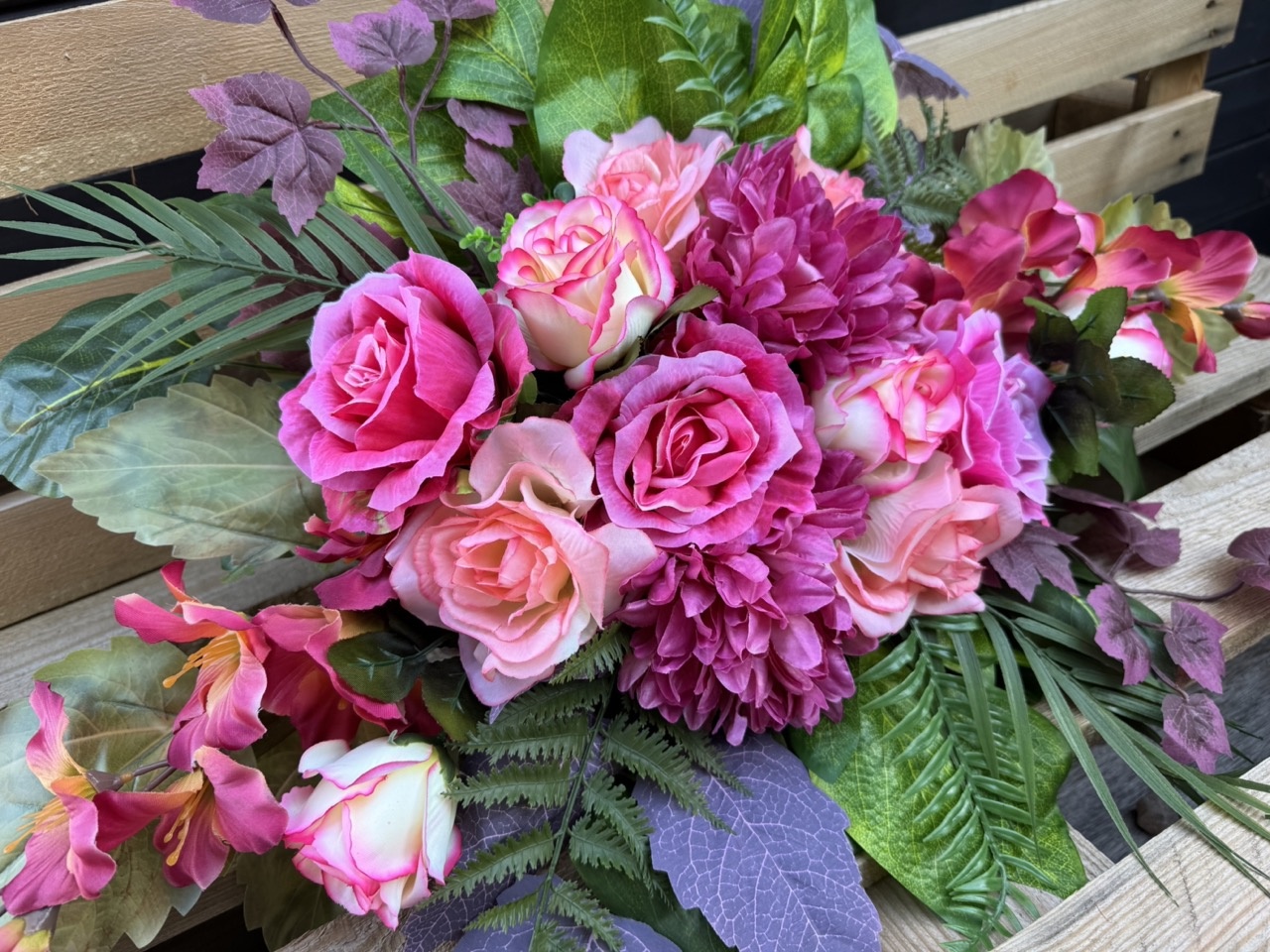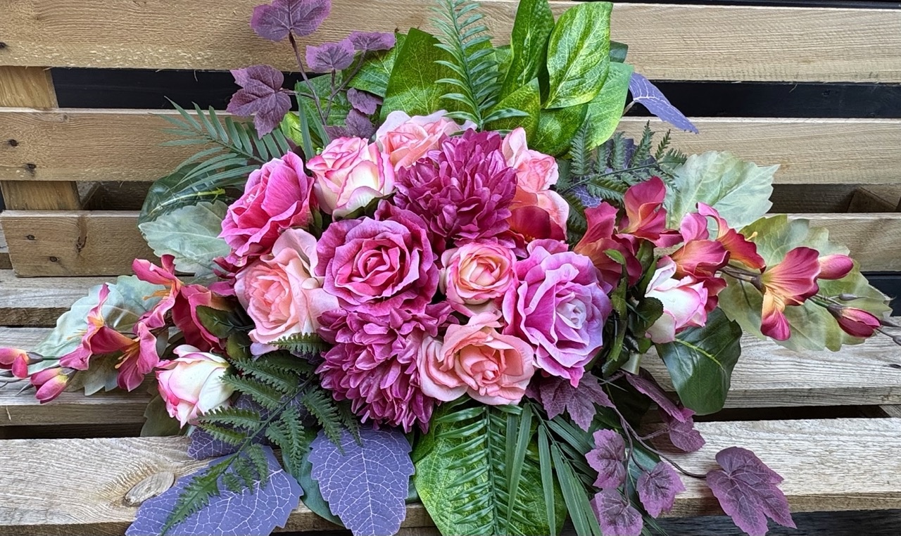 Duża, bogata, piękna wiązanka na grób w pięknych kolorach. WYGLĄDA JAK ŻYWA! Wykonana z kwiatów oraz sztucznych dodatków najwyższej jakości.