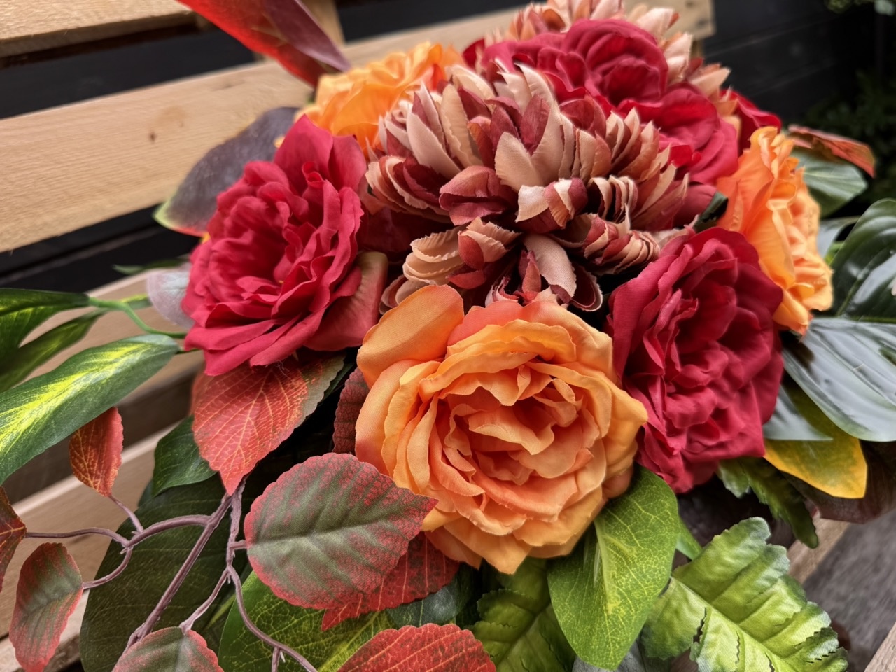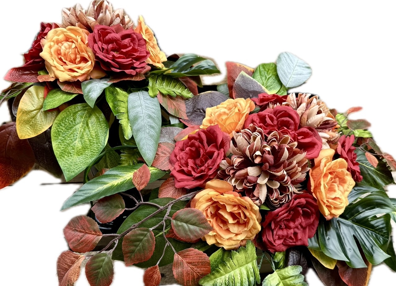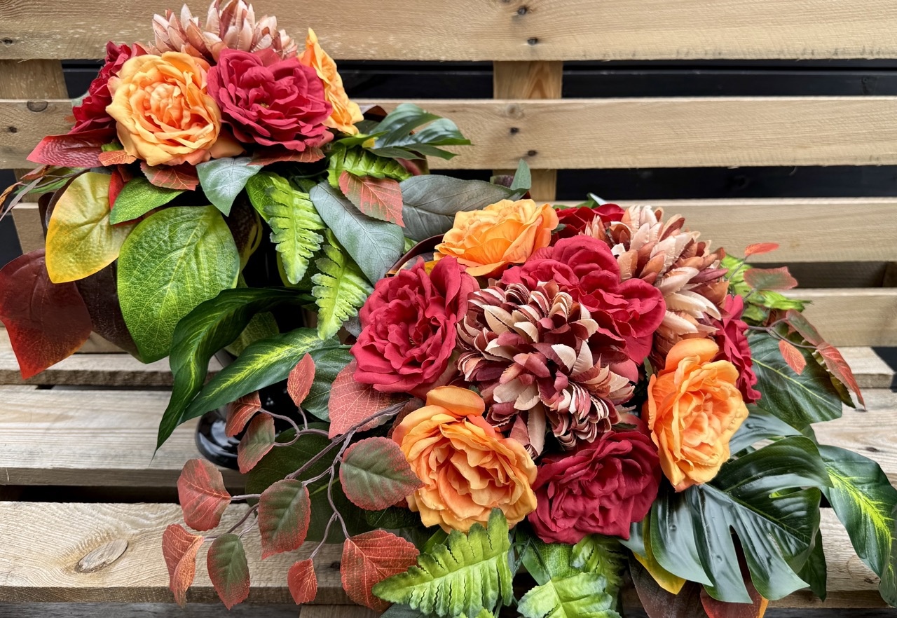 - zestaw chryzantem i róż angielskich w odcieniach żółci, pomarańczy, ciemnej czerwieni,