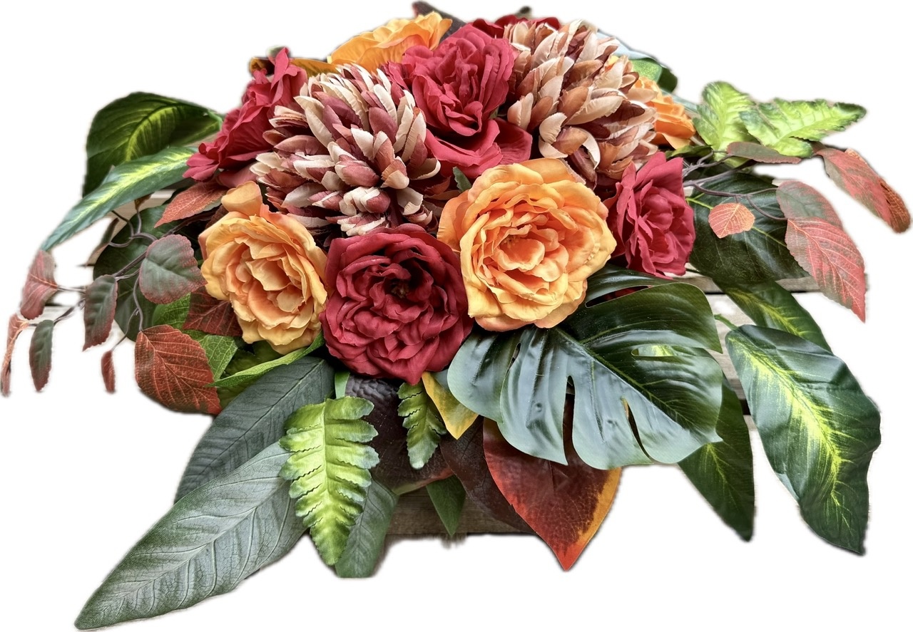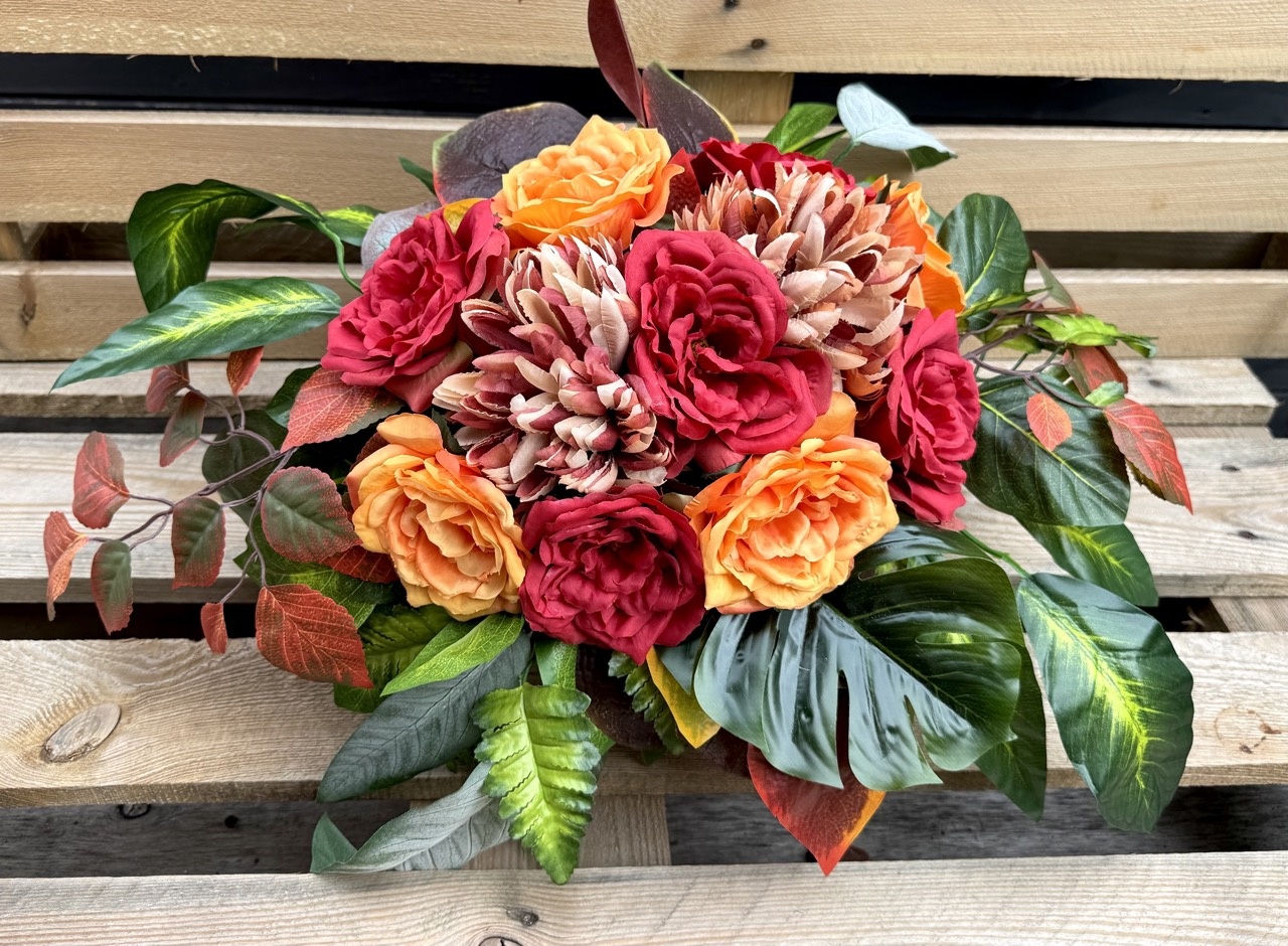 Wiązanka w pięknych, jesiennych kolorach wykonana0 z kwiatów i sztucznych dodatków wysokiej jakości.