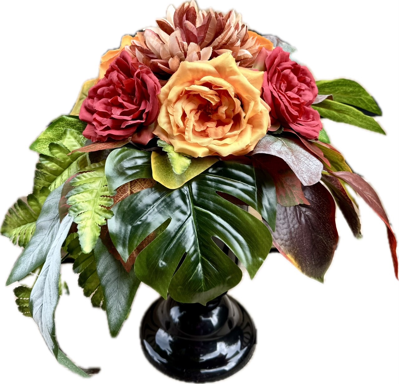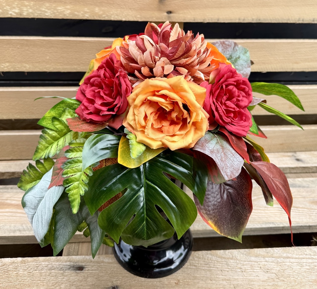 - zestaw chryzantem i róż angielskich w odcieniach żółci, pomarańczy, ciemnej czerwieni,