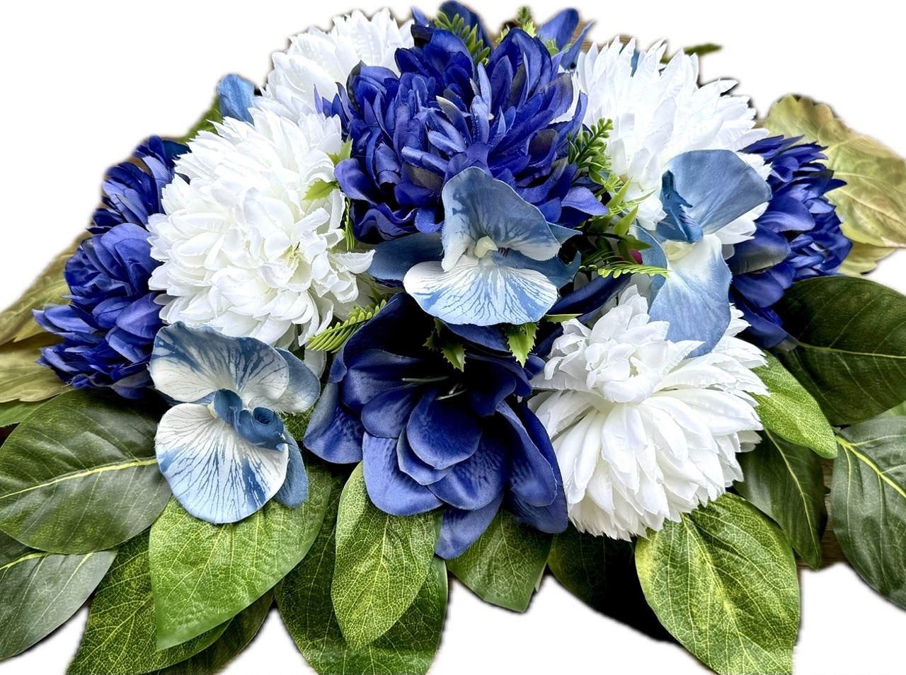 Duża, bogata, piękna wiązanka na grób w nowoczesnym niebieskim kolorze. Wykonana z kwiatów oraz sztucznych dodatków wysokiej jakości.