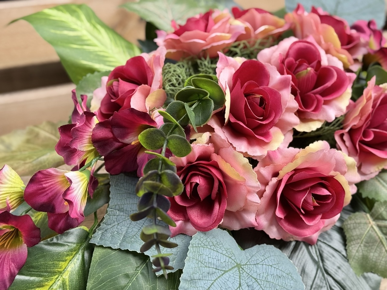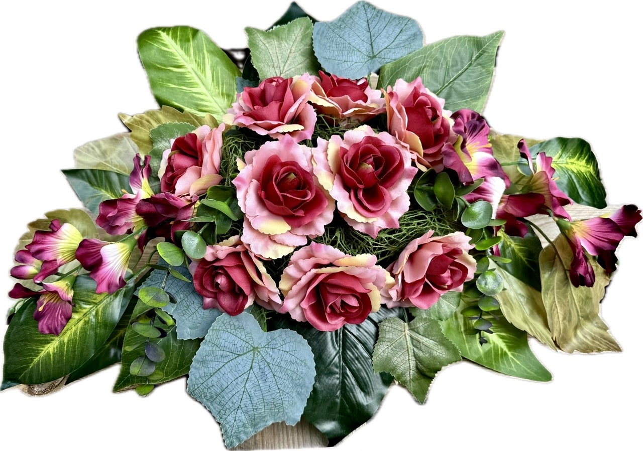Duży i bardzo ładna wiązanka w oryginalnym kolorze eleganckiego cieniowanego ciemnego różu i fioletu, wykonana z dodatków florystycznych wysokiej jakości.