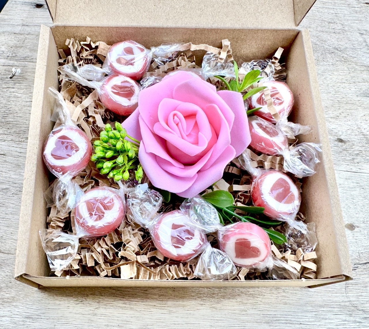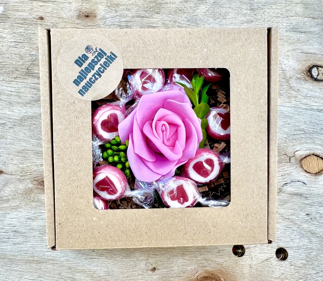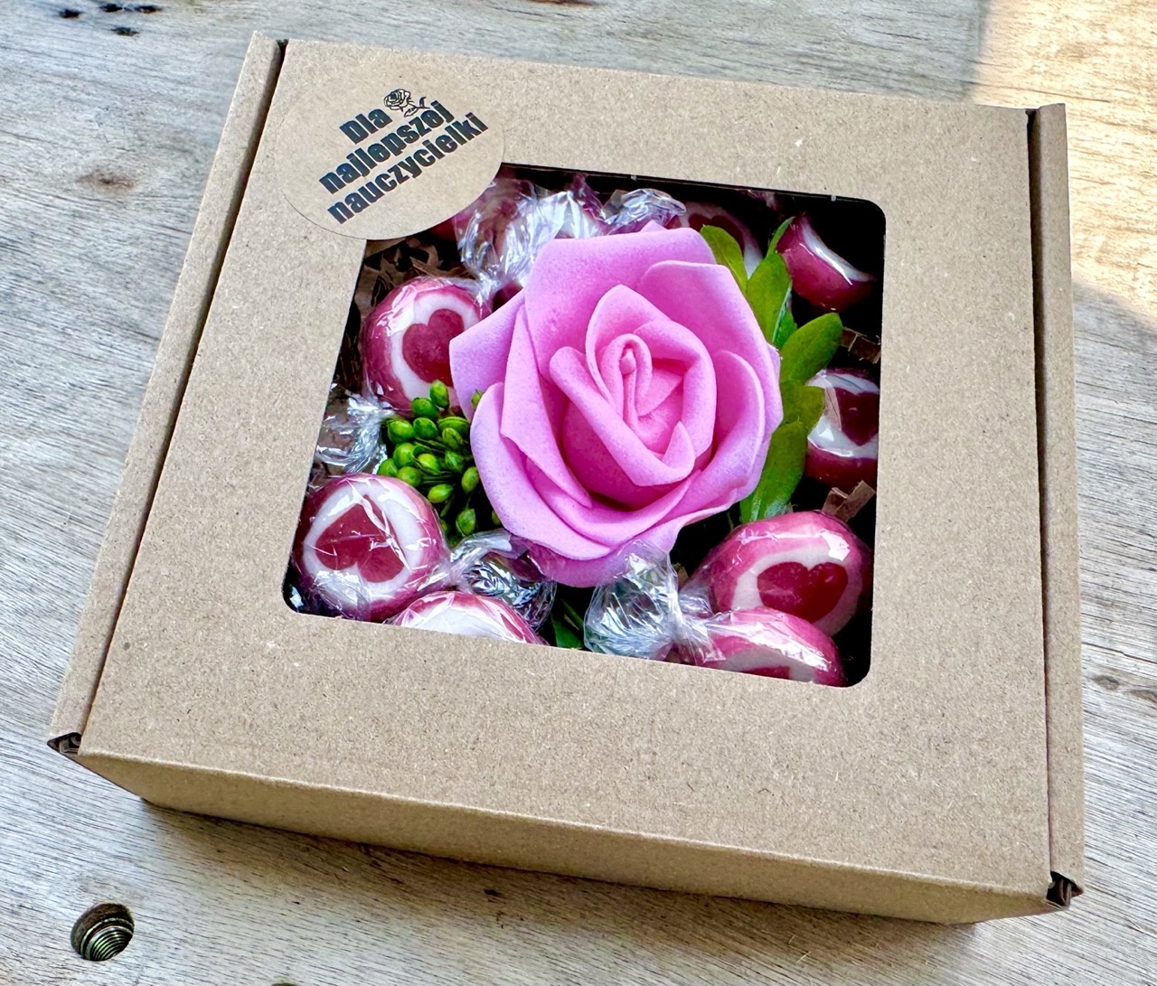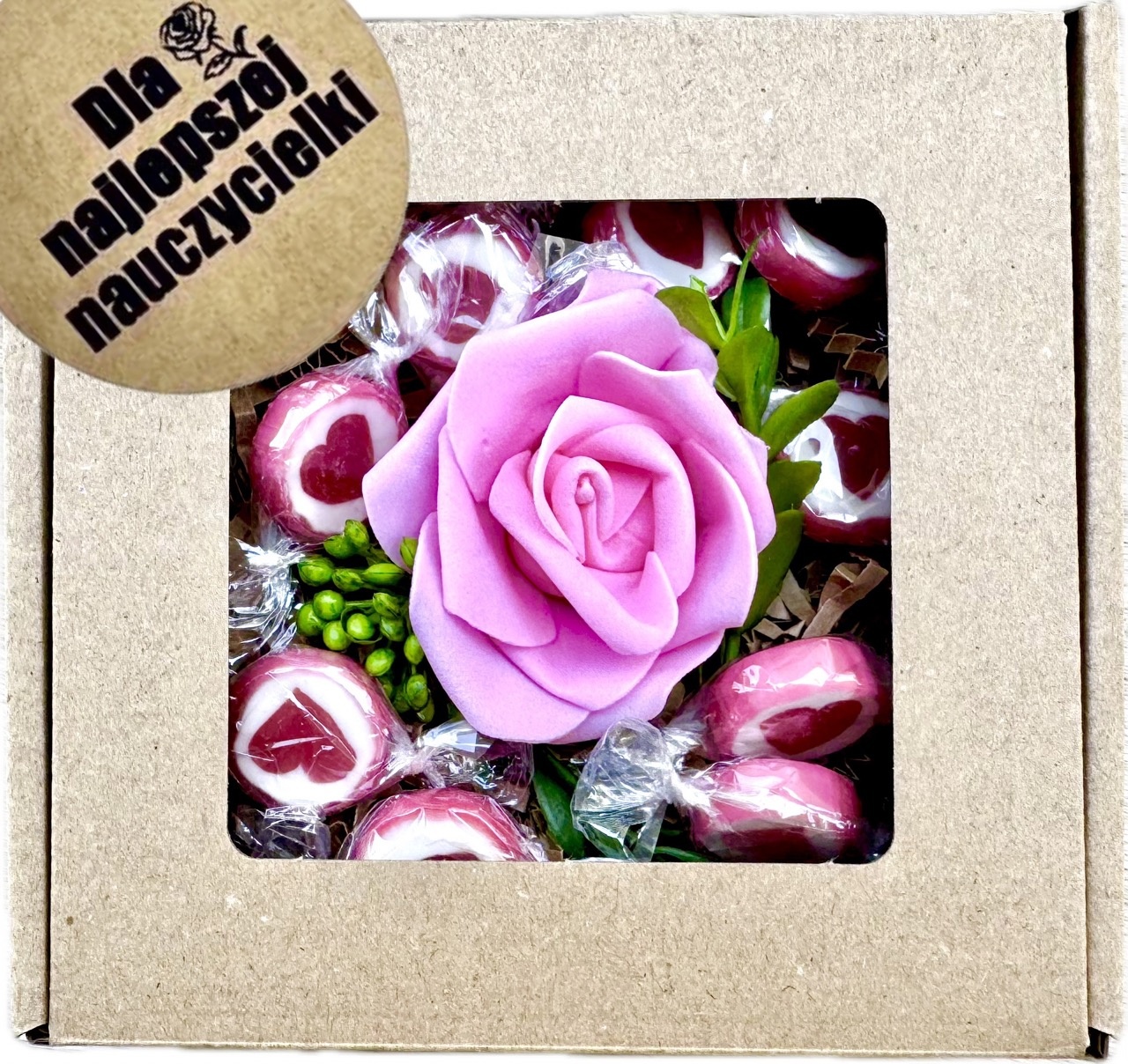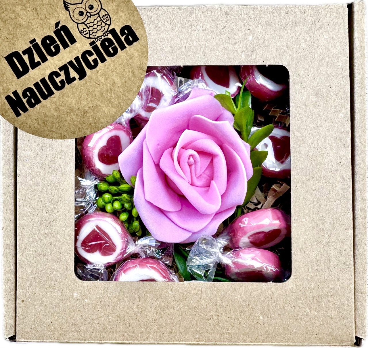 - box prezentowy z napisem "Dzień Kobiet", pudełko z okienkiem o rozmiarze 13x13 cm,
