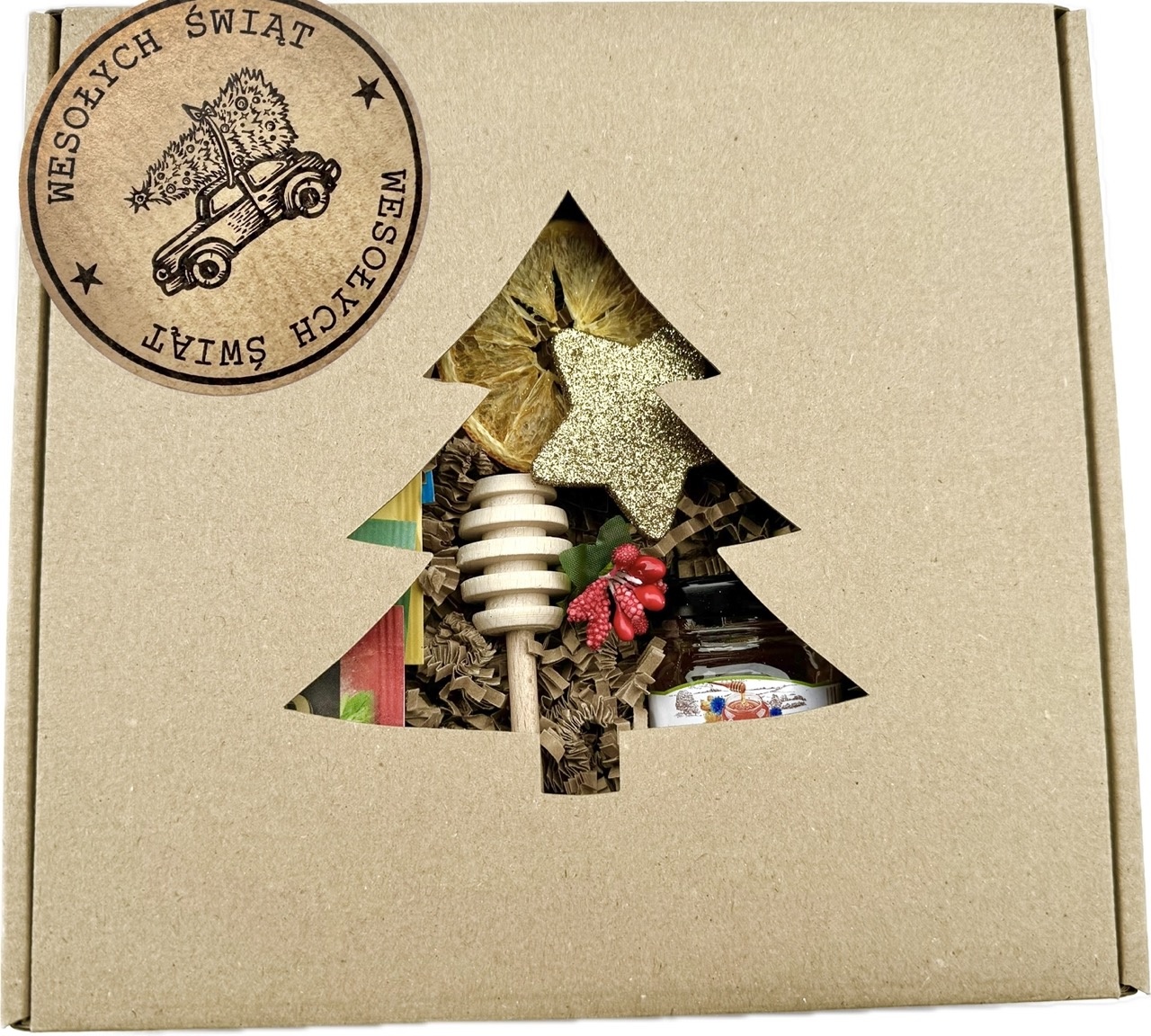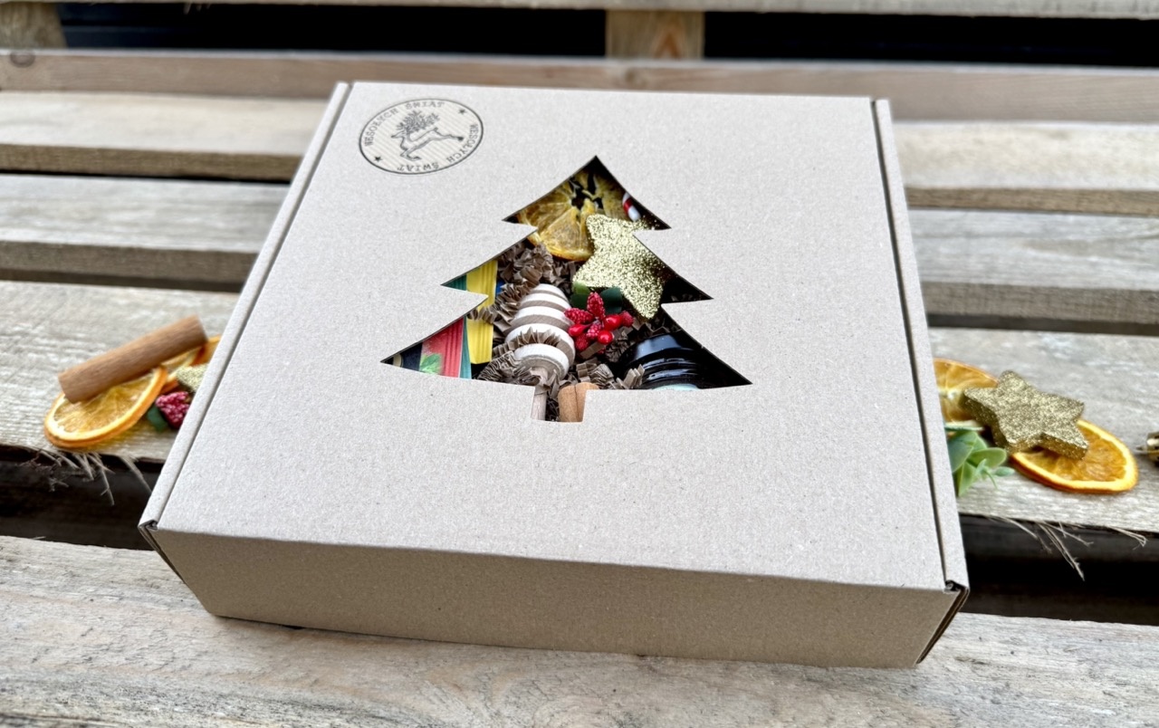- pudełko z okienkiem w kształcie choinki i napisem, rozmiar 20x20x5 cm,